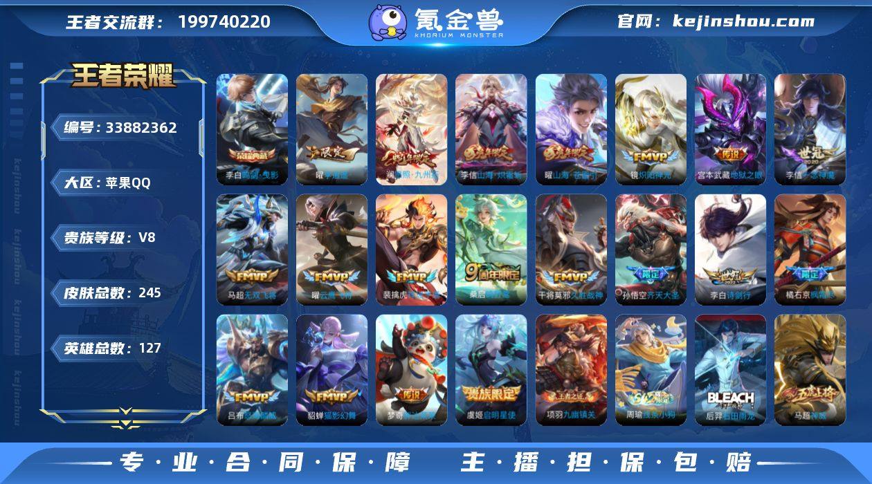 实名: 可修改 性别: 男号 贵族等级: V8 英雄数: 127 皮肤数: 245 荣耀水晶: 鸣剑·曳影 传说皮: 云鹰飞将,猫影幻舞,久胜战神,炽阳神光,一念神魔,地狱之眼,胖达荣荣,李逍遥,无双飞将,山海·炽霜斩,山海·苍雷引,祥瑞亨通 限定皮: 遇见飞天,梁祝,神威,天狼狩猎者,朱雀志,高山流水,孙行者,猪悟能,匿光追影者,傲雪梅枪,玉兔公主,枫霜尽,匿光启智者,五谷丰年,诗剑行,怒海麟威,山海·玄木吟,齐天大圣,鸣野蒿,愿照·九州拓 亮点: 【优质装备】:鸣剑·曳影,云鹰飞将(小将军),猫影幻舞,久胜战神,炽阳神光,一念神魔,地狱之眼,胖达荣荣,李逍遥,无双飞将,山海·炽霜斩(李信年限),山海·苍雷引(电光曜子)