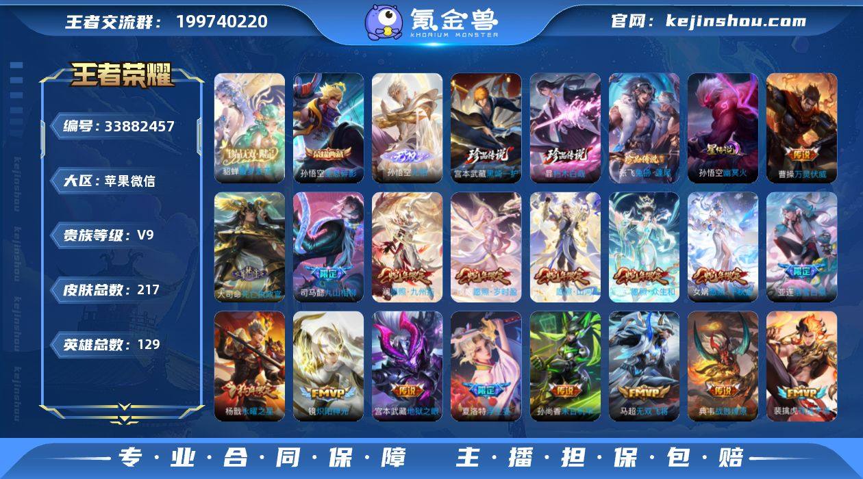 苹果WX-V9-至尊星耀IV段位-129英雄-217皮肤-1典藏皮肤-1珍品无双-1无双-3珍品传说-28传说-79史诗 【英雄全皮】:孙权全皮,敖隐全皮,空空儿全皮,影全皮 【荣耀典藏】:孙悟空全息碎影 【珍品无双】:貂蝉馥梦繁花 【无双皮肤】:孙悟空无相 【珍品传说】:宫本武藏黑崎一护,暃朽木白哉,张飞兔狲蓬尾 【传说皮肤】:曹操万灵伏威,大司命死亡执政官,司马懿九山相柳,司空震愿照山河定,女娲愿照千秋盛,妲己愿照众生和,澜愿照九州拓,虞姬愿照岁时盈,云缨幻光神枪,裴擒虎祥瑞亨通,亚连落雪白狼,典韦战鼓燎原,诸葛亮鹤羽星尊,夏洛特浮生妄,马超无双飞将,铠绛天战甲,镜炽阳神光,虞姬启明星使,张良黄金白羊座,干将莫邪久胜战神,梦奇胖达荣荣,后羿黄金射手座,杨戬永曜之星,貂蝉仲夏夜之梦,孙尚香末日机甲,宫本武藏地狱之眼,孙悟空地狱火,武则天海洋之心 【限定皮肤】:蔡文姬夏日便利店,狄仁杰阴阳师,赵云皇家上将,庄周高山流水,元歌云间偶戏,元歌无心,马可波罗暗影游猎,狄仁杰魔术师,项羽海滩派对,孙悟空至尊宝,孙悟空大圣娶亲,后羿辉光之辰,刘备百相守梦,虞姬启明星使,杨戬永曜之星,雅典娜单词大作战,诸葛亮鹤羽星尊,百里玄策原初追...