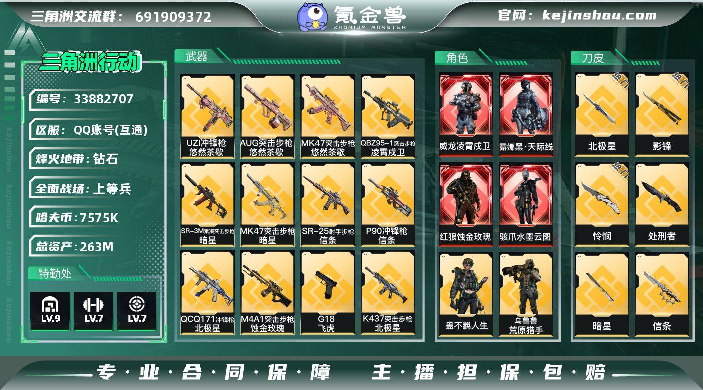 【sjs11305】【⭐ 包人脸 玩够能回血 6刀皮4红皮带飞虎 高特勤 总资产263m 】 sjs11305 263m总资产-7575k哈夫币-60烽火等级-钻石-32战场等级-上等兵 【干员外观】:红狼-蚀金玫瑰,骇爪-水墨云图,露娜-黑·天际线,威龙-凌霄戍卫,威龙-飞虎,蜂医-送葬人·无题密令,无名-夜鹰,深蓝-不破誓约,红狼-电锯惊魂,露娜-金牌射手,乌鲁鲁-荒原猎手,蛊-不羁人生 【近战皮肤】:近战-暗星,近战-北极星,近战-信条,近战-黑海,近战-影锋,近战-怜悯,近战-处刑者1级,近战-黑鹰 【传说外观】:M4A1突击步枪-蚀金玫瑰,M4A1突击步枪-阿米娅,QBZ95-1突击步枪-凌霄戍卫,AUG突击步枪-悠然茶歇,SG552突击步枪-运动员,AK-12突击步枪-夜鹰,AK-12突击步枪-特斯拉线圈,SCAR-H战斗步枪-水墨云图,SCAR-H战斗步枪-启航,SCAR-H战斗步枪-荼蘼,G3战斗步枪-骑士,CAR-15突击步枪-阿米娅,腾龙突击步枪-捞点薯条,腾龙突击步枪-马年祥瑞,腾龙突击步枪-万金泪冠,K437突击步枪-北极星,KC17突击步枪-电锯惊魂,MK47突击步枪-悠然茶歇,MK47突击步枪-暗星,MP5冲锋枪-黑海,P90冲锋枪-信条,UZI冲锋枪-特斯拉线圈,UZI冲锋枪-悠然茶歇,SMG-45冲锋枪-骑士,SR-3M紧凑突击步枪-特斯拉线圈,...