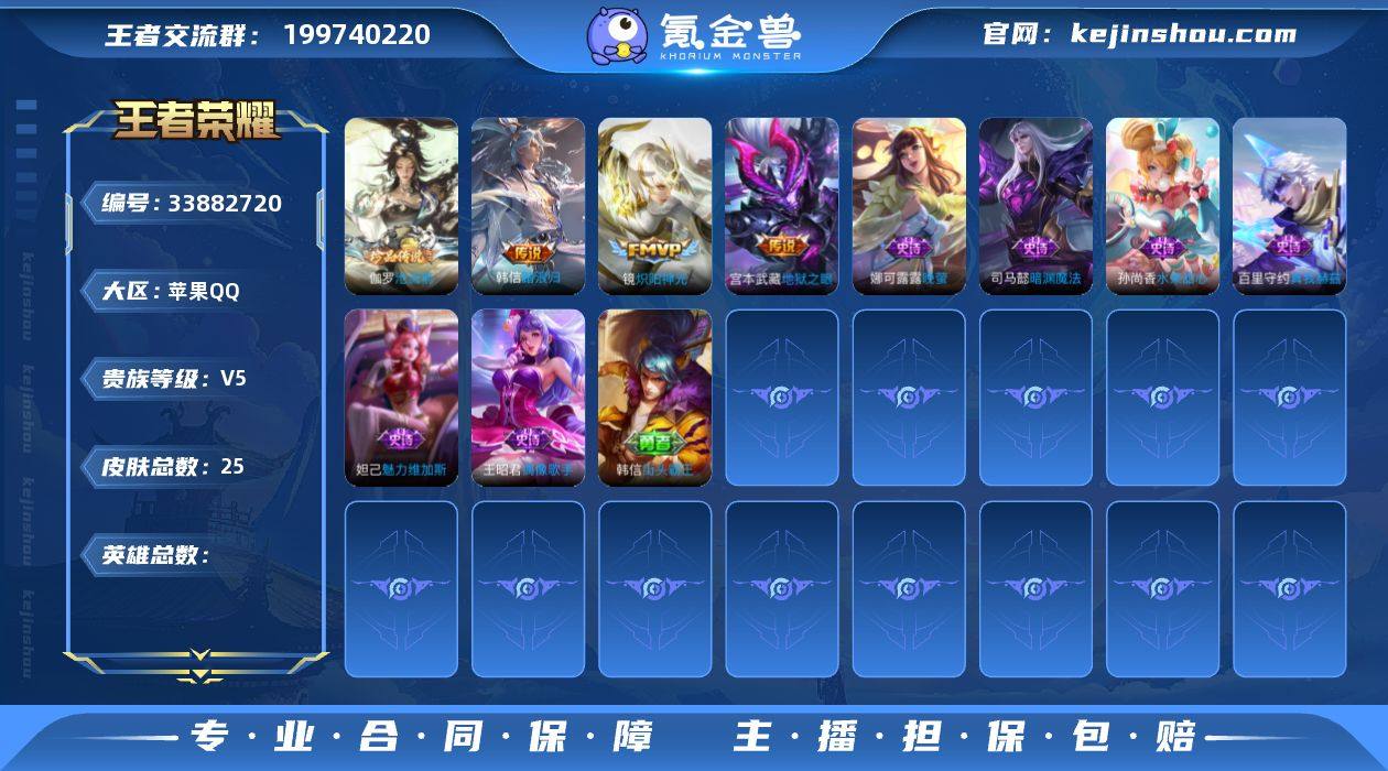 【其他皮肤】:吕布舞狮寰,虞姬溯影追猎,孙权径山谋武,亚瑟荣光之誓,诸葛亮掌控之力,王昭君幻想奇妙夜,后羿阿尔法小队,亚瑟死亡骑士,韩信街头霸王,项羽海滩派对,马可波罗激情绿茵,曹操超能战警【商品标题】:苹果Q-Vundefined-至尊星耀II-0英雄-25皮肤-0典藏-0无双-1珍品传说-3传说-8史诗
