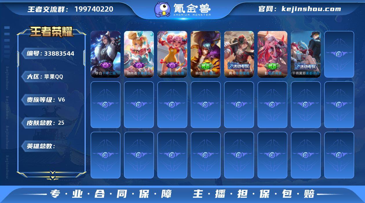 【其他皮肤】:艾琳鹤鸣心笺,王昭君幻想奇妙夜,亚瑟死亡骑士,芈月红桃皇后,项羽海滩派对,司空震启蛰,裴擒虎街头旋风,铠龙域领主,虞姬加勒比小姐,孙悟空西部大镖客,露娜绯红之刃【商品标题】:苹果Q-Vundefined-尊贵铂金II-0英雄-25皮肤-0典藏-0无双-0珍品传说-1传说-3史诗