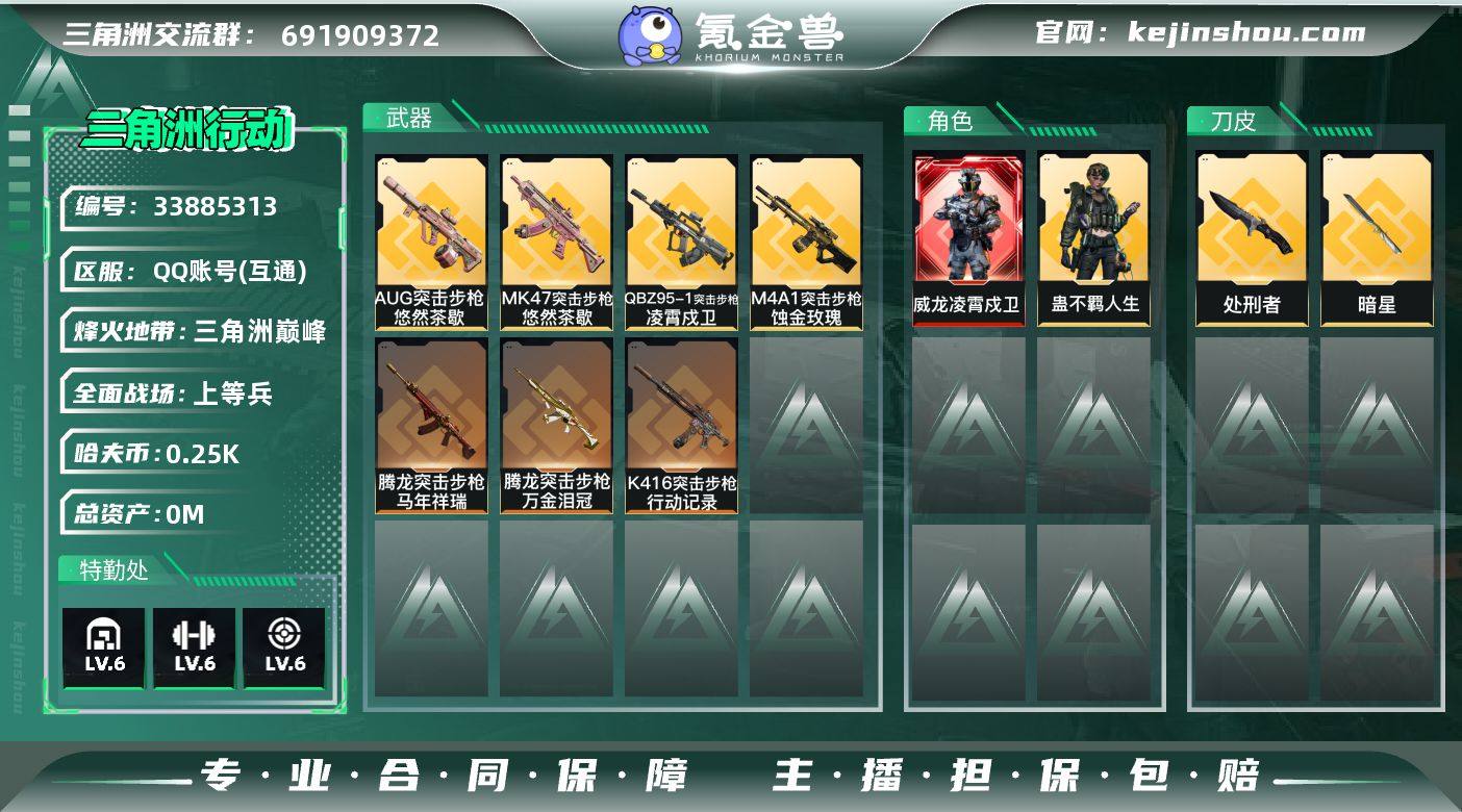 实名: 不可修改 烽火地带段位: 三角洲巅峰 全面战场段位: 上等兵 总资产: 32 哈夫币: 252 干员外观: 威龙-凌霄戍卫,蛊-不羁人生 传说武器皮肤: M4A1突击步枪-蚀金玫瑰,近战-暗星,近战-处刑者,QBZ95-1突击步枪-凌霄戍卫,K416突击步枪-行动记录,腾龙突击步枪-马年祥瑞,腾龙突击步枪-万金泪冠,MK47突击步枪-悠然茶歇,AUG突击步枪-悠然茶歇