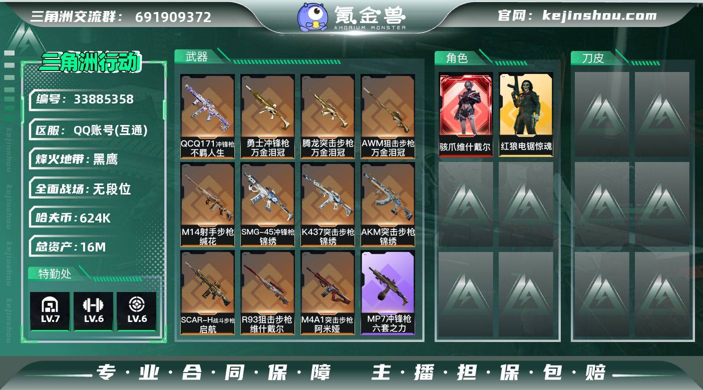【SJZF8160】总资产16M/哈夫币62万/传说枪皮数11/战场等级1/行动等级60/安全箱等时效性道具以游戏内数据为准,详情请看图/骇爪-维什戴尔/红狼-电锯惊魂/近战-黑鹰/M4A1突击步枪-阿米娅/AKM突击步枪-锦绣/SCAR-H战斗步枪-启航/腾龙突击步枪-万金泪冠/K437突击步枪-锦绣/SMG-45冲锋枪-锦绣/勇士冲锋枪-万金泪冠/QCQ171冲锋枪-不羁人生/M14射手步枪-缄花/R93狙击步枪-维什戴尔/AWM狙击步枪-万金泪冠/K416突击步枪-阿萨拉特攻/MP5冲锋枪-战术竞备/MP5冲锋枪-竞技风/勇士冲锋枪-深海恐惧/勇士冲锋枪-工业狂潮/MP7冲锋枪-六套之力/QJB201轻机枪-炽焰/SV98狙击步枪-猎鳄行动/M700狙击步枪-竞技风/沙漠之鹰-曙光/AKM突击步枪-肃杀/QBZ95-1突击步枪-公平竞技/K416突击步枪-一帆风顺/M7战斗步枪-捣蛋鬼/SG552突击步枪-2026/SG552突击步枪-贴花艺术/ AK-12突击步枪-马年新春/SCAR-H战斗步枪-荣耀列队/MP5冲锋枪-弄臣/MP5冲锋枪-哈夫克卫队/P90冲锋枪-黄昏/Vector冲锋枪-先锋/UZI冲锋枪-前沿科技/UZI冲锋枪-亚特兰蒂斯/SMG-45冲锋枪-行动开启/SMG-45冲锋枪-幻影结构/M249轻机枪-毛鲁斯之力/M249轻机枪-冰天雪地/QJB201轻机枪-哈夫克卫队/Mini-14射手步枪-荣耀列队/SR-25射手步枪-开拓/SV-9...