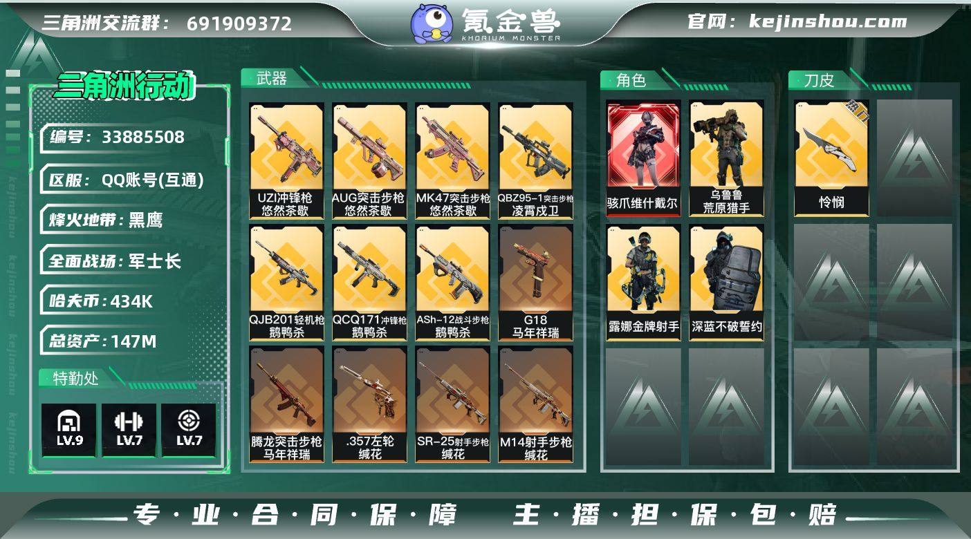 【PTSJZ3172】总资产147M/哈夫币43万/传说近战数1/传说枪皮数23/战场等级31/行动等级60/安全箱等时效性道具以游戏内数据为准,详情请看图/骇爪-维什戴尔/深蓝-不破誓约(S6)/露娜-金牌射手(S7)/乌鲁鲁-荒原猎手/近战-怜悯/近战-黑鹰/M4A1突击步枪-阿米娅/AKM突击步枪-锦绣/QBZ95-1突击步枪-凌霄戍卫/ASh-12战斗步枪-鹅鸭杀/AUG突击步枪-悠然茶歇/SG552突击步枪-运动员/SCAR-H战斗步枪-启航/CAR-15突击步枪-阿米娅/腾龙突击步枪-马年祥瑞/K437突击步枪-锦绣/KC17突击步枪-电锯惊魂/MK47突击步枪-悠然茶歇/UZI冲锋枪-悠然茶歇/SMG-45冲锋枪-锦绣/QCQ171冲锋枪-鹅鸭杀/M250通用机枪-骑士之心/QJB201轻机枪-鹅鸭杀/M14射手步枪-蛮荒/M14射手步枪-缄花/SR-25射手步枪-缄花/R93狙击步枪-维什戴尔/.357左轮-缄花/G18-马年祥瑞/SVD狙击步枪-檀劫铳影/ASh-12战斗步枪-无极限/K416突击步枪-冬日风情/K416突击步枪-腊梅/K416突击步枪-阿萨拉特攻/M7战斗步枪-百步穿杨/SG552突击步枪-哈夫克警备/SCAR-H战斗步枪-囚徒/G3战斗步枪-流沙送葬/G3战斗步枪-哈夫克警备/AS Val突击步枪-百步穿杨/腾龙突击步枪-猎鳄行动/K437突击步枪-守护者/K437突击步枪-丛林谍踪/MP5冲锋枪-战术竞备/MP5冲锋枪-竞...