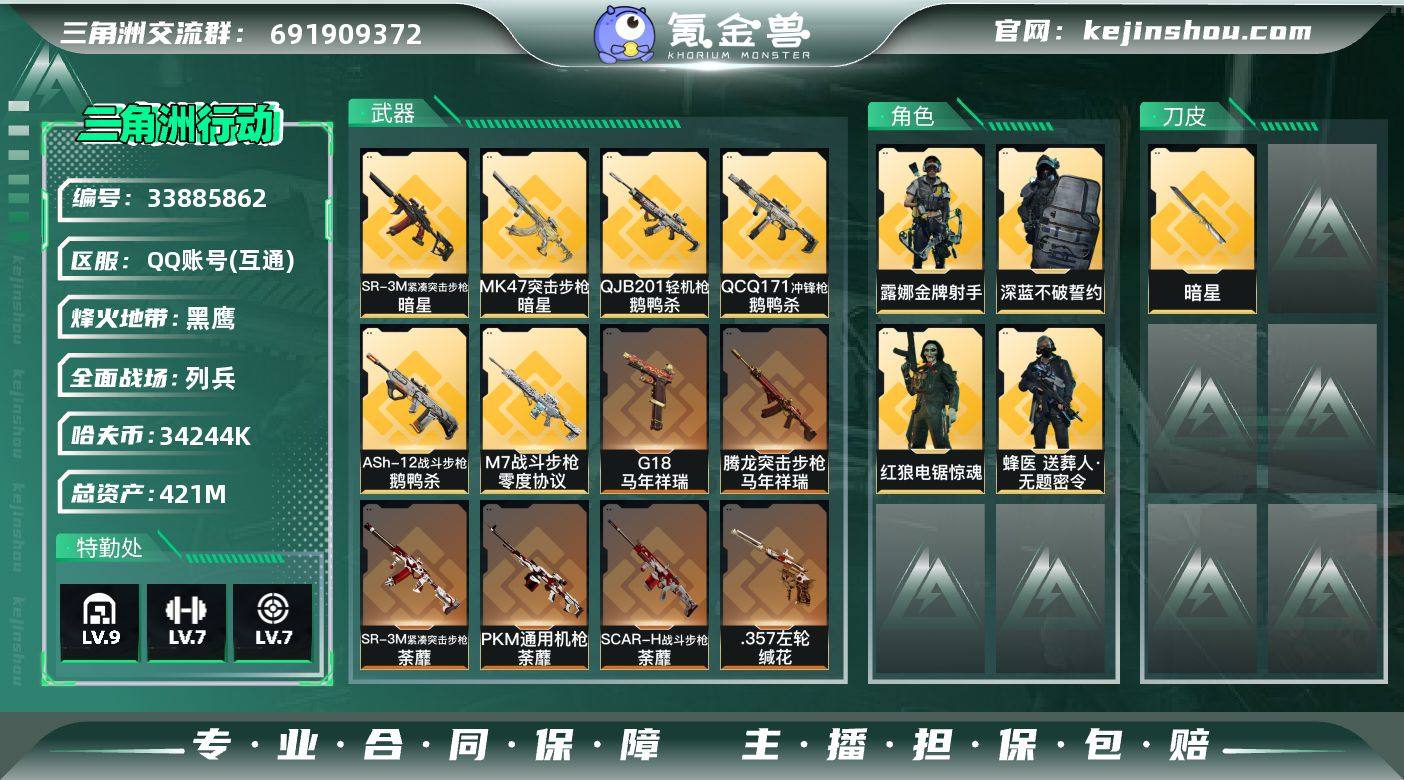 QQD251/包人脸/QQ区【总资产:421M+近战暗星+近战处刑者+s5s6s7s8赛季通行证+S8炫彩安全箱零号玩家+非洲之心+高级咖啡豆+103发AWM子弹】红狼-电锯惊魂】/烽火等级:60/全面战场:14/纯币:34244K/三角券加币:146(3三角币+143三角券)//部门:33432/特勤等级(技术中心3级/工作台3级/制药台3级/防具台3级/仓库9级/指挥中心6级/训练中心7级/靶场7级/潜水中心3级/收藏室2级)---暗星捆绑包---/橙色挂饰x8/流动资产:226M段位:黑鹰III/详细看图/信用分105
