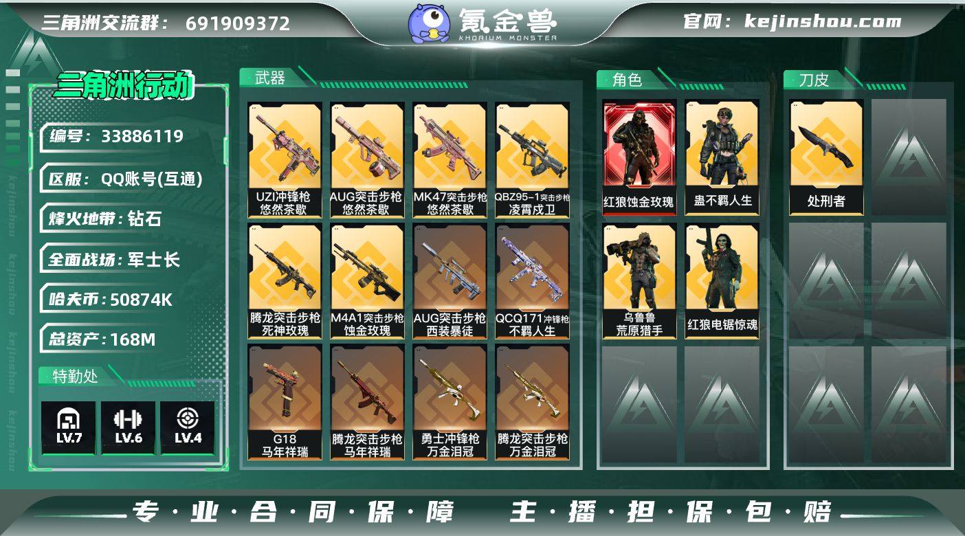 QQM109/包人脸/QQ区【高资产169M+70发AWM子弹多六套蚀金玫瑰精品猛攻号】【总资产:169M+红皮蚀金玫瑰】【s9赛季通行证已买2X3】【电锯惊魂-不羁人生-荒原猎手】/烽火等级:60/全面战场:38/纯币:50874k/三角券加币:556(60三角币+496三角券)//部门:22222/特勤等级(技术中心3级/工作台3级/制药台3级/防具台3级/仓库7级/指挥中心3级/训练中心6级/靶场4级/潜水中心1级/收藏室1级)/橙色挂饰x5/流动资产:149M段位:钻石三/详细看图