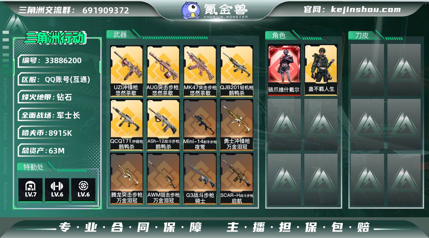 QQD309/包人脸/QQ区【总资产:63M+骇爪维什戴尔+20发AWM子弹+小红门卡】/烽火等级:60/全面战场:50/纯币:8915K/三角券加币:280(40三角币+240三角券)【蛊-不羁人生】//部门:22322/特勤等级(技术中心3级/工作台3级/制药台3级/防具台3级/仓库7级/指挥中心5级/训练中心6级/靶场6级/潜水中心1级/收藏室0级)---捆绑包---/橙色挂饰x5/流动资产:47M段位:钻石IV/详细看图