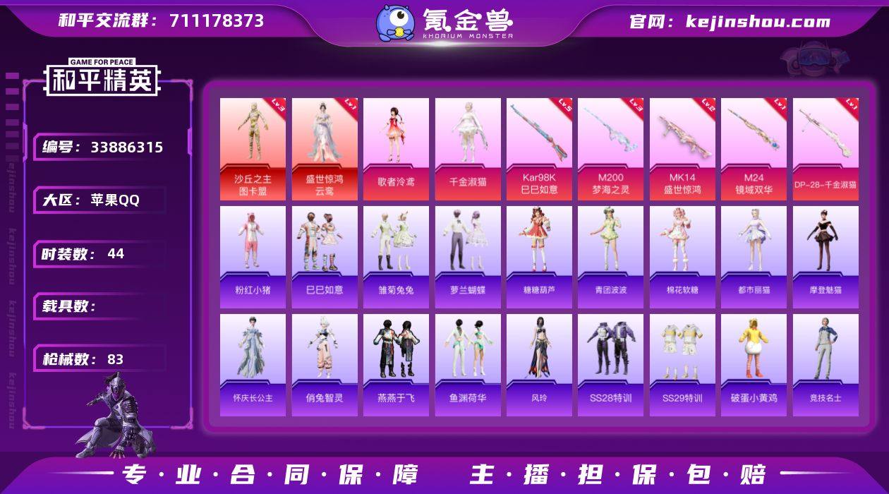 苹果手Q-2神装-2粉装-5特效枪-8粉色飞行器-30546热力值-4王牌印记-44套装-83枪皮 【红色神装等级】:盛世惊鸿-云鸾(一级),沙丘之主-图卡盟(三级) 【红色角色神装】:盛世惊鸿-云鸾,沙丘之主-图卡盟 【热门品类】:套装-粉红小猪 【粉色套装】:角色-歌者泠鸢,角色-千金淑猫 【粉色枪皮等级】:Kar98K-巳巳如意(五级),M24-镜域双华(一级),Mk14-盛世惊鸿(二级),M200-梦海之灵(三级),DP-28-千金淑猫(一级) 【粉色枪皮】:Kar98K-巳巳如意,M24-镜域双华,Mk14-盛世惊鸿,M200-梦海之灵,DP-28-千金淑猫 【粉色飞行器】:酣梦熊熊飞行器,祥瑞起舞飞行器,歌者泠鸢飞行器,沙丘之主天马,镜域双华-灵镜之阶,幻海精灵飞行器,深渊漩涡飞行器,凤舞九天飞行器 【粉色降落伞】:太空嘟嘟降落伞,歌者泠鸢降落伞,镜域双华降落伞,千金淑猫降落伞,临安公主降落伞,盛世惊鸿降落伞 【稀有套装】:套装-巳巳如意,套装-雏菊兔兔,套装-萝兰蝴蝶,套装-糖糖葫芦,套装-青团波波,套装-棉花软糖,角色-都市丽猫,角色-摩登魅猫,角色-怀庆长公主,角色-俏兔智灵,套装-燕燕于飞,套装-鱼渊荷华,角色-风玲 【稀有枪皮】:M16A4-千金淑猫,M416-蓝色火焰,GROZA-懵萌河马,AUG-天...