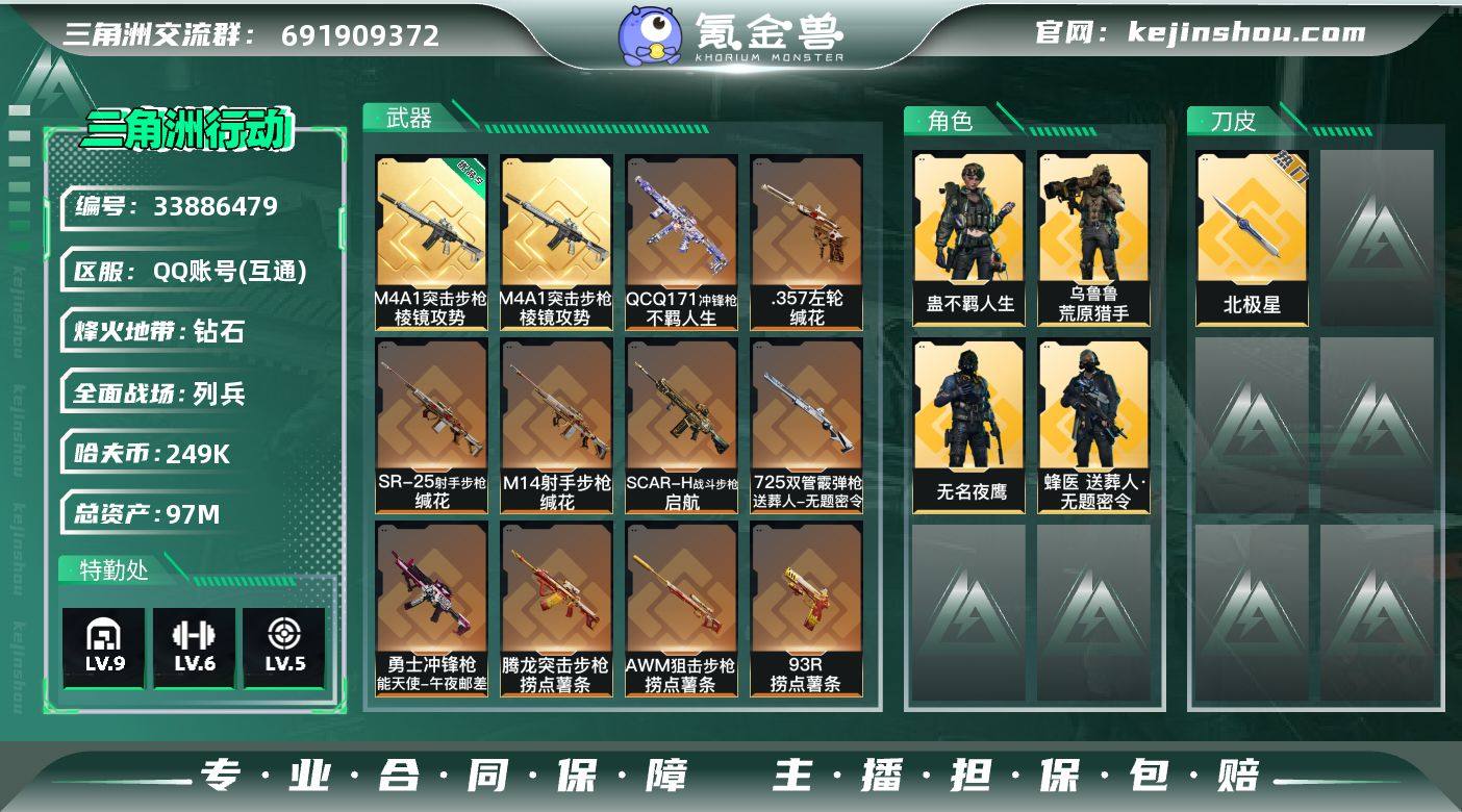 【SJZ5102】总资产97M/哈夫币24万/传说近战数1/传说枪皮数20/战场等级29/行动等级60/安全箱等时效性道具以游戏内数据为准,详情请看图/非洲之心/蜂医-送葬人·无题密令(S5)/无名-夜鹰(S4)/乌鲁鲁-荒原猎手/蛊-不羁人生/近战-北极星/近战-黑鹰/M4A1突击步枪-棱镜攻势/优品S典藏武器外观-M4A1突击步枪-棱镜攻势/M4A1突击步枪-阿米娅/AK-12突击步枪-夜鹰/AK-12突击步枪-特斯拉线圈/SCAR-H战斗步枪-启航/CAR-15突击步枪-阿米娅/腾龙突击步枪-捞点薯条/UZI冲锋枪-特斯拉线圈/SMG45冲锋枪-骑士/SR-3M紧凑突击步枪-特斯拉线圈/勇士冲锋枪-能天使-午夜邮差/QCQ171冲锋枪-不羁人生/725双管霰弹枪-送葬人-无题密令/M14射手步枪-蛮荒/M14射手步枪-缄花/SR-25射手步枪-缄花/AWM狙击步枪-捞点薯条/.357左轮-缄花/93R-捞点薯条/复合弓-黑-天际线/AKM突击步枪-林中猎手/QBZ95-1突击步枪-曙光/Ash-12战斗步枪-守夜人/K416突击步枪-腊梅/M16A4突击步枪-竞赛选手/SG552突击步枪-尖端治疗/AS Val突击步枪-尖端治疗/腾龙突击步枪-无垢/K437突击步枪-丛林谍踪/MP5冲锋枪-深海恐惧/Vector冲锋枪-阿萨拉文明/SR-3M紧凑突击步枪-荒野求生/SR-3M紧凑突击步枪-开工大吉/勇士冲锋枪-深海恐惧/勇士冲锋枪-工...