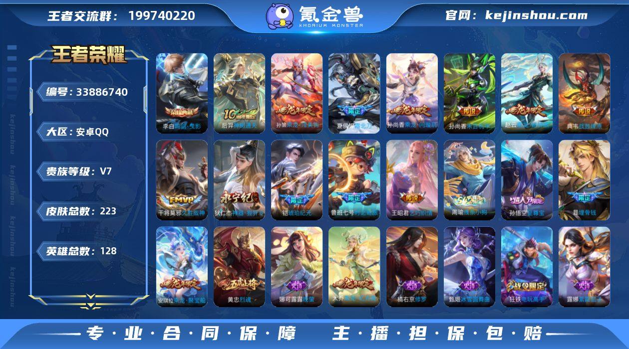 贵族等级7/荣耀典藏数量1/传说皮肤数量13/史诗皮肤数量60/皮肤数量223/英雄数量128/段位至尊星耀/孙权全皮/敖隐全皮/鸣剑·曳影/马超神骥逐星野/神树通天/夏侯惇霜北刀/典韦战鼓燎原/乘龙·问璇玑/乘龙·淬吴钩/乘龙·铭钟鼎/琥珀纪元铠/鲁班七号-时之奇旅/神器·狴犴令/乞巧织情/久胜战神/末日机甲-孙尚香/埋骨钱/蒙犽顽岩魄/大乔绒语心约/天穹之誓(s36)/阴阳师/凯尔特女王(s7)/皇家上将/蔷薇恋人/超时空战士-钟无艳/重明(s11)/赤莲之焰/朔风刀(s17)/游园惊梦/落雪兰心/烛龙(s10)/穷奇(s12)/魔术师/万华元夜(s22)/沙漠行僧(s26)/海滩派对/醍醐杖(s20)/演武夺筹(s23)/午后时光/驯魔猎人/金庭之子(s27)/至尊宝/御旌(s15)/匿光侦查者/云中旅人(s29)/驱傩正仪(s24)/胡桃夹子/黎明之约/繁星吟游/饕餮(s9)/原初探秘者(s21)/五谷丰年/烈魂/千军破阵(s25)/原初追遂者/混沌棋(s18)/顽趣-梦奇/大漠名商(s28)/疑决卦(s19)/李小龙/御狮(s13)/电玩高手/御霄(s14)/天狼溯光者/御銮(s16)/梁祝/暖冬·兔眠/玲珑珍味/探海日志(s32)/驭风魔法/江河有灵/古海寻踪(s33)/高渐离燃音魔法/妲己灵卜魔法/鬼谷子天穹祈灯(S34)/琥珀纪元伽罗/乘龙·忆丹青/乘龙·聚宝船/龙武盛年/熔金海岸/噬灭天穹(s37)/线条小...