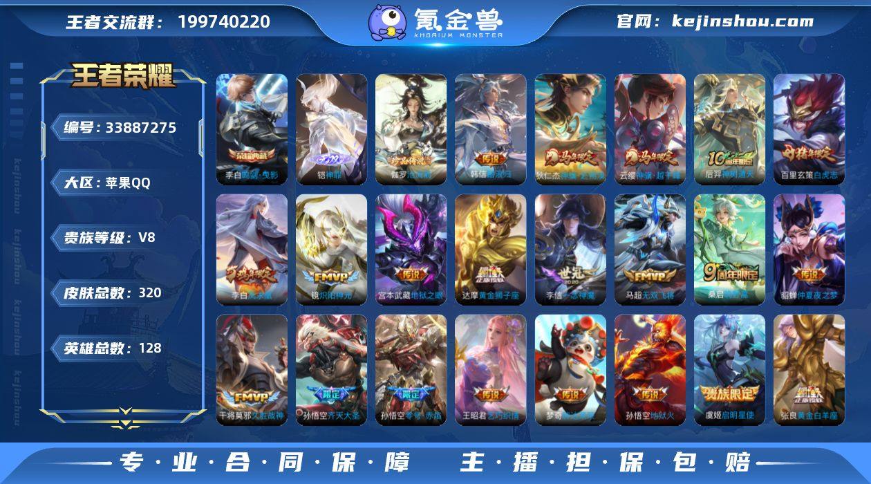 【王者荣耀】珍品无双0 典藏1 无双1 珍品传说1 传说25 史诗93 英雄128 皮肤320 贵族8级 荣耀典藏:鸣剑·曳影__无双皮肤:神罪__珍品传说:沧流箭__传说皮肤:鸣野蒿|无双飞将|绛天战甲|炽阳神光|启明星使|胖达荣荣|地狱之眼|地狱火|仲夏夜之梦|久胜战神|黄金狮子座|狄仁杰-超时空战士|黄金白羊座|一念神魔|乞巧织情|孙尚香-末日机甲|齐天大圣|白虎志|凤求凰|零号·赤焰|神树通天|花木兰-异界灵契|神骥·赴朔漠|神骥·越千峰|踏浪归__稀有限定:至尊宝|青龙志|朱雀志|大圣娶亲|一生所爱|飞衡|奇迹圣诞|神威|青春决赛季|猪悟能|李小龙|梁祝|狮舞东方|拒霜思|暗影游猎|白昼王子|冰锋战神|繁星吟游|海滩派对|航海奇遇记|胡桃异想国|华丽摇滚|皇家上将|辉光之辰|混沌棋|凯尔特女王|狂想玩偶喵|蓝屏警告|黎明之约|炼金王|迷踪丽影|魔术师|女武神|千军破阵|穷奇|驱傩正仪|圣诞老人|朔风刀|死亡摇滚|饕餮|醍醐杖|天狼狩猎者|万华元夜|王者之锤|妄想食味|无心|纤云弄巧|星空之诺|驯魔猎人|演武夺筹|妖精王|疑决卦|阴阳师|银河之约|遇见飞天|御旌|御銮|御狮|原初追逐者|云间偶戏|暗隐猎兽者|缤纷独角兽|冰冠公主|冰雪圆舞曲|苍穹之光|乘风破浪|大乔-猫狗日记|德古拉伯爵|地狱岩魂|电玩小子|功夫...