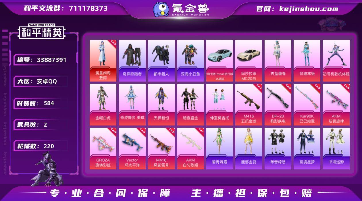 【特价出售】钱包不能注销安卓Q-1红装4稀有2载具8粉装9特效枪18热门154套装220枪皮 68840热力值 9印记 历史超级王牌11星 【1红装】 魔童闹海-敖丙 (2级) 【4稀有】 奇异狩猎者 AKM-缤纷海域 都市猎人 浪漫天命 【2载具】 玛莎拉蒂M白色 保时捷Taycan旅行版(冰晶蓝) 【8粉装】 紫螳螂 奇迹舞步美琪 异瞳寒姬 金曜白虎 霁蓝缠春 仲夏莫吉托 天禅智恒 暗夜鎏金 【9特效枪】 M416-五爪金龙 (7级) AKM-炫紫旋律 (4级) AKM-白勺歌姬 (1级) Kar98K-巳巳如意 (5级) DP-28-豹影疾电 (5级) GROZA-旋转彩虹 (4级) M416-风花雪月 (2级) Mk14-福马献瑞 (1级) Vector-环太平洋 (3级) 【18热门】 小丑鱼 呆萌铁蟹 鹰眼刺客 迅捷狂鲨 深海小丑鱼 TianBa战队服 暗影哥特 团圆交子 瑞龙福将 狂沙舞者 漫步者 破蛋小黄鸡 军刀雅典娜 英勇保护者 弄潮海豚 M762-奇异狩猎者 M762-瑞龙福将 M24-奇异狩猎者 【1飞行器】 梦幻火箭飞行器 【2头盔】 童趣迷兔头盔 深海小丑鱼头盔 【2背包】 梦幻火箭背包 深海小丑鱼背包