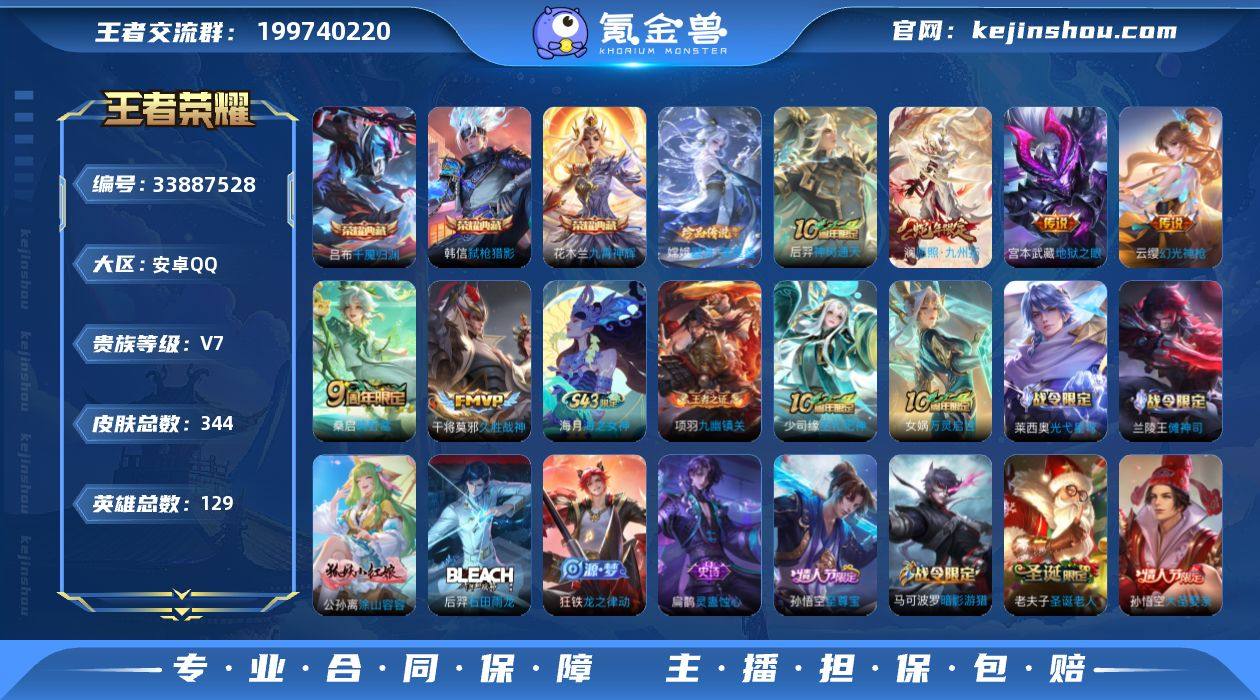 【王者荣耀】珍品无双0 典藏3 无双0 珍品传说1 传说6 史诗90 英雄129 皮肤344 贵族7级 荣耀典藏:九霄神辉|弑枪猎影|千魇归渊__珍品传说:器灵·落星盏__传说皮肤:鸣野蒿|地狱之眼|久胜战神|幻光神枪|愿照·九州拓|神树通天__稀有限定:御风骁将|至尊宝|大圣娶亲|猪悟能|李小龙|拒霜思|暗影游猎|白昼王子|大漠名商|电玩高手|繁星吟游|高山流水|古海寻踪|海滩派对|海盐诗旅|航海奇遇记|胡桃夹子|胡桃异想国|皇家上将|混沌棋|剑破天穹|江河有灵|金庭之子|凯尔特女王|狂想玩偶喵|黎明之约|魔术师|女武神|千军破阵|擒涛扼浪|穷奇|驱傩正仪|燃音魔法|荣光圣徽|沙漠行僧|圣诞老人|朔风刀|探海日志|饕餮|醍醐杖|天穹祈灯|玩趣恶龙|万华元夜|无心|五谷丰年|午后时光|纤云弄巧|演武夺筹|疑决卦|阴阳师|遇见飞天|御旌|御銮|御狮|原初追逐者|云间偶戏|暗夜贵公子|暗隐猎兽者|缤纷独角兽|冰冠公主|冰雪圆舞曲|乘风破浪|大乔-猫狗日记|德古拉伯爵|地狱岩魂|功夫厨神|鬼剑武藏|黄金分割率|箭羽风息|节奏热浪|金属风暴|吕布-末日机甲|魅语|梦奇-顽趣|女仆咖啡|偶像歌手|绅士熊喵|圣诞狂欢|圣诞恋歌|水果甜心|水晶猎龙者|孙策-猫狗日记|天才门将|天秀·启明|赵云-未来纪元|星夜王子|摇滚巨星|鹰眼统...
