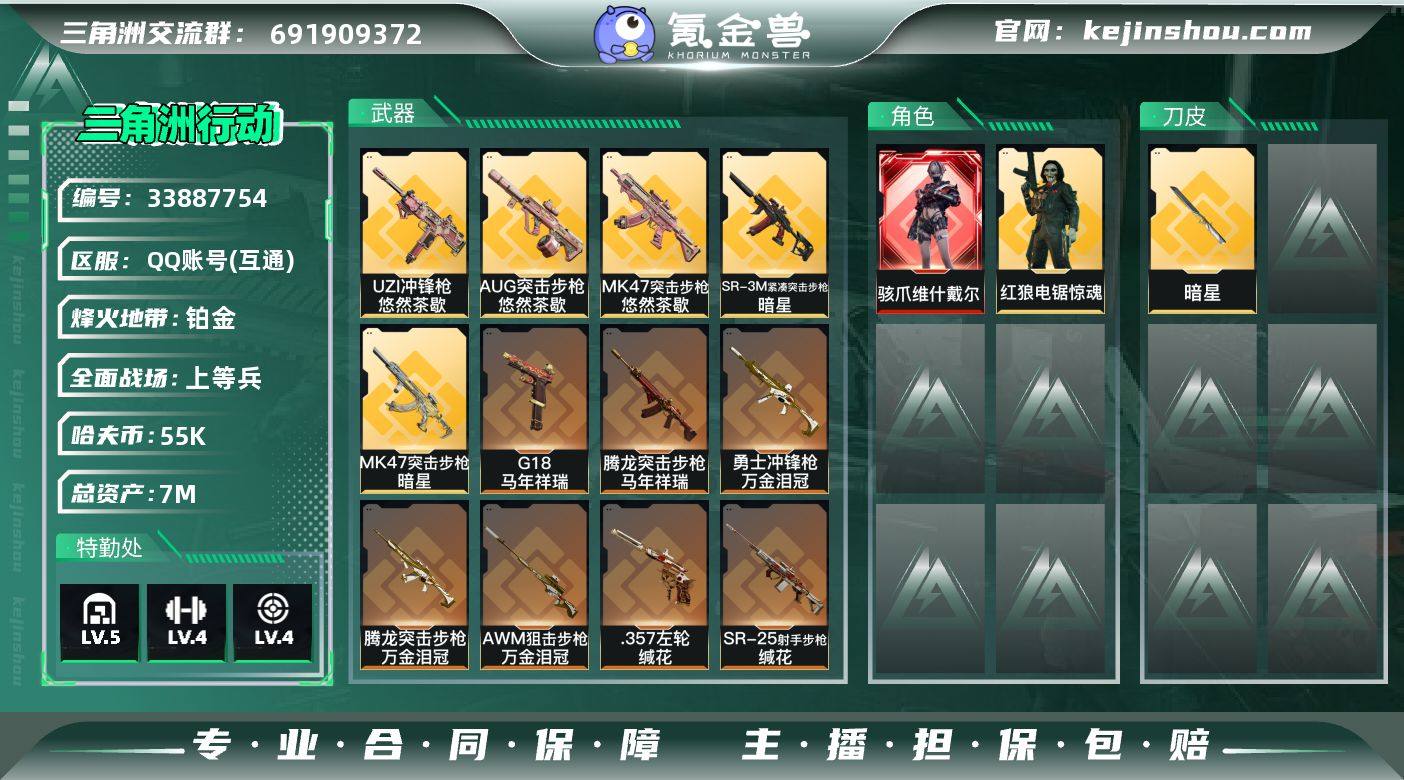 【936330】烽火地带段位: 铂金 全面战场段位: 上等兵 总资产: 7000000 哈夫币: 55000 干员外观: 骇爪-维什戴尔,红狼-电锯惊魂 传说武器皮肤: M4A1突击步枪-阿米娅,CAR-15突击步枪-阿米娅,勇士冲锋枪-能天使-午夜邮差,Vector冲锋枪-能天使-午夜邮差,R93狙击步枪-维什戴尔,SCAR-H战斗步枪-启航,KC17突击步枪-电锯惊魂,近战-暗星,MK47突击步枪-暗星,SR-3M紧凑突击步枪-暗星,腾龙突击步枪-马年祥瑞,G18-马年祥瑞,勇士冲锋枪-万金泪冠,腾龙突击步枪-万金泪冠,AWM狙击步枪-万金泪冠,.357左轮-缄花,SR-25射手步枪-缄花,M14射手步枪-缄花,SMG-45冲锋枪-锦绣,K437突击步枪-锦绣,AKM突击步枪-锦绣 史诗武器皮肤: 沙漠之鹰-曙光,AUG突击步枪-蝮蛇,M700狙击步枪-蝮蛇,SV-98狙击步枪-囚徒,SCAR-H战斗步枪-囚徒,P90冲锋枪-紧急戒备,腾龙突击步枪-猎鳄行动,SV98狙击步枪-猎鳄行动,Vector冲锋枪-猎鳄行动,勇士冲锋枪-工业狂潮,SR-3M紧凑突击步枪-战术竞备,MP5冲锋枪-战术竞备,M700狙击步枪-哈夫克警备,SG552突击步枪-哈夫克警备,G3战斗步枪-哈夫克警备,K416突击步枪-冬日风情,M14射手步枪-工业狂潮,SMG45冲锋枪-阿萨拉特攻,PKM通用机枪-阿萨拉特攻,MP7冲锋枪-六套之力 载具皮肤: 轮式突击炮-荣...