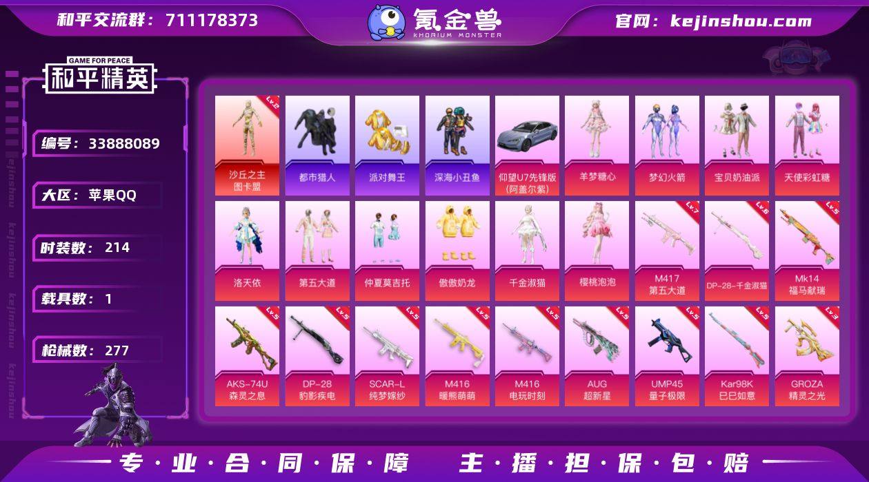【kyhp2268】苹果手Q-1神装-10粉装-19特效枪-1载具-12粉色飞行器-92086热力值-18王牌印记-214套装-277枪皮 【红色神装等级】:沙丘之主-图卡盟(二级) 【红色角色神装】:沙丘之主-图卡盟 【热门品类】:粉装-梦幻火箭,套装-都市猎人,套装-派对舞王,套装-深海小丑鱼,套装-小丑鱼,套装-浪漫波比,角色-Mark.06 【粉色套装】:粉装-宝贝奶油派,粉装-天使彩虹糖,粉装-梦幻火箭,角色-洛天依,粉装-第五大道,粉装-仲夏莫吉托,粉装-傲傲奶龙,角色-千金淑猫,角色-樱桃泡泡,角色-羊梦糖心 【粉色枪皮等级】:SCAR-L-纯梦嫁纱(五级),M416-暖熊萌萌(五级),M416-电玩时刻(五级),GROZA-精灵之光(三级),AUG-超新星(五级),AUG-罪夜之冕(一级),ACE32-萌骑漫游(一级),UMP45-量子极限(五级),AKS-74U-森灵之息(五级),Kar98K-巳巳如意(五级),M24-镜域双华(三级),Mk14-福马献瑞(五级),M417-第五大道(七级),M200-梦海之灵(一级),M249-绝对恒星(一级),DP-28-千金淑猫(六级),DP-28-豹影疾电(五级),MG3-洛神天依(三级),PKM-萌骑夺宝(一级) 【粉色载具】:仰望U7(阿盖尔紫) 【粉色枪皮】:SCAR-L-纯梦嫁纱,M416-暖熊萌萌,M416-电玩时刻,GROZA-精灵之光,AUG-超新星...