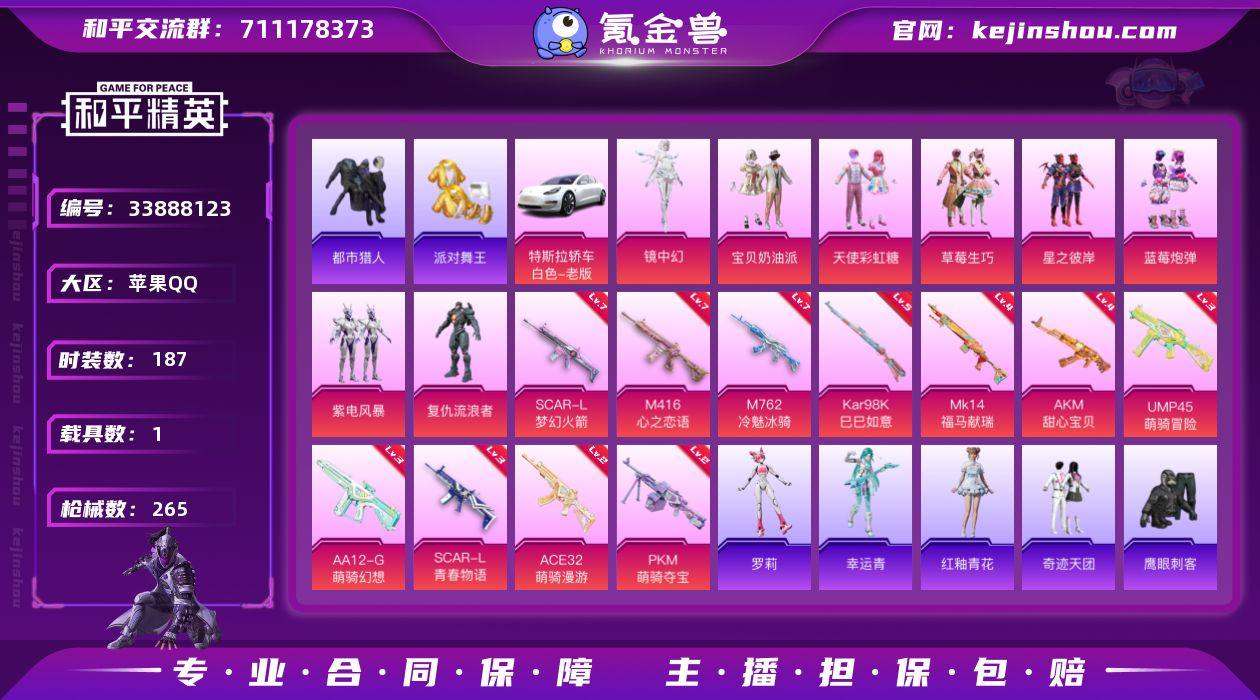 【951807】无二次-苹果手Q-8粉装-11特效枪-1载具-1粉色飞行器-85494热力值-20王牌印记-187套装-265枪皮 【热门品类】:套装-都市猎人,套装-派对舞王,套装-龟仙人,套装-粉红小猪,熔岩游骑兵连帽夹克 【粉色套装】:粉装-宝贝奶油派,粉装-天使彩虹糖,粉装-草莓生巧,粉装-星之彼岸,粉装-蓝莓炮弹,粉装-紫电风暴,角色-复仇流浪者,角色-镜中幻 【粉色枪皮等级】:AKM-甜心宝贝(四级),SCAR-L-梦幻火箭(七级),SCAR-L-青春物语(三级),M416-心之恋语(七级),M762-冷魅冰骑(七级),ACE32-萌骑漫游(二级),UMP45-萌骑冒险(三级),Kar98K-巳巳如意(五级),Mk14-福马献瑞(四级),AA12-G-萌骑幻想(三级),PKM-萌骑夺宝(二级) 【粉色载具】:特斯拉Model 3(珍珠白) 【粉色枪皮】:AKM-甜心宝贝,SCAR-L-梦幻火箭,SCAR-L-青春物语,M416-心之恋语,M762-冷魅冰骑,ACE32-萌骑漫游,UMP45-萌骑冒险,Kar98K-巳巳如意,Mk14-福马献瑞,AA12-G-萌骑幻想,PKM-萌骑夺宝 【粉色降落伞】:甜心宝贝降落伞,至尊龙雀降落伞,四圣焕新降落伞,心之恋语降落伞,星之彼岸降落伞,暗夜玫瑰降落伞,齐天大圣降落伞,暗星紫秘降落伞,冷魅冰骑降落伞,环太平洋降落伞,临安公主降落伞 【稀...