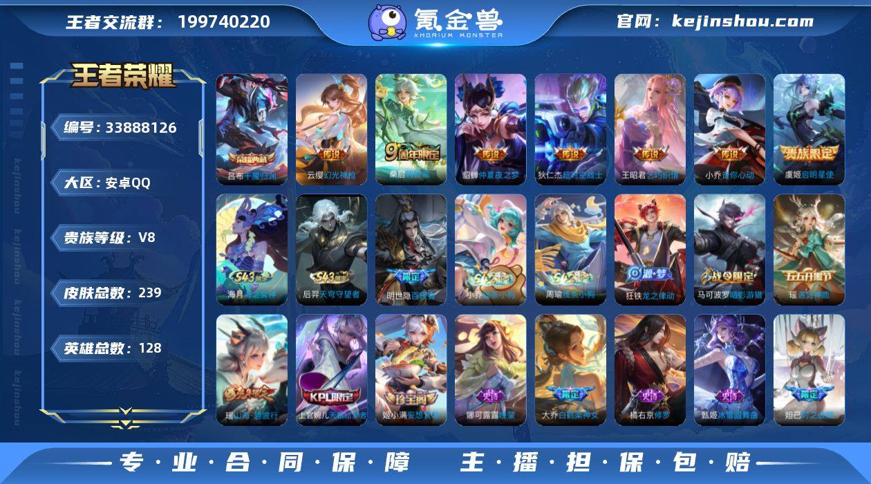 安卓Q-V8-最强王者段位-128英雄-239皮肤-1典藏皮肤-7传说-59史诗 【英雄全皮】:刘邦全皮,孙权全皮,敖隐全皮 【荣耀典藏】:吕布千魇归渊 【传说皮肤】:云缨幻光神枪,桑启鸣野蒿,王昭君乞巧织情,小乔音你心动,虞姬启明星使,貂蝉仲夏夜之梦,狄仁杰超时空战士 【限定皮肤】:姜子牙天穹之誓,杨戬破阵退雄兵,狄仁杰阴阳师,赵云皇家上将,墨子神迹守卫,妲己时之彼端,孙尚香蔷薇恋人,庄周高山流水,阿轲迷踪丽影,孙膑天狼运算者,芈月幻夜卜梦,周瑜赤莲之焰,甄姬游园惊梦,曹操天狼征服者,典韦穷奇,马可波罗暗影游猎,狄仁杰魔术师,狄仁杰万华元夜,达摩沙漠行僧,项羽海滩派对,老夫子醍醐杖,老夫子航海奇遇记,安琪拉魔法小厨娘,程咬金演武夺筹,刘邦夺宝奇兵,兰陵王金庭之子,亚瑟潮玩骑士王,后羿圣弓游侠,李元芳银河之约,虞姬启明星使,钟馗驱傩正仪,杨玉环遇见飞天,干将莫邪真爱魔法,雅典娜单词大作战,雅典娜黎明之约,蔡文姬奇迹圣诞,蔡文姬繁星吟游,鬼谷子原初探秘者,大乔白鹤梁神女,苏烈千军破阵,弈星混沌棋,沈梦溪星空之诺,沈梦溪大漠名商,明世隐疑决卦,裴擒虎李小龙,裴擒虎擒涛扼浪,米莱狄御霄,瑶山海碧波行,云中君纤云弄巧...