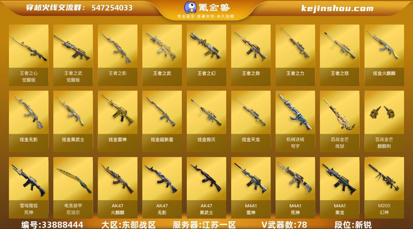 【940270】江苏一区-86V-13王者武器数-9炫金武器数 【热门武器】:QBZ03-金色蔷薇,Scar Light-白虎,M200-幻神,死亡之眼,汤姆逊-烈龙*5,加特林-炼狱*3,斯泰尔-蝴蝶,沙鹰-修罗*2 【王者炫金武器】:王者之幻*2,王者之势,王者之武,王者之影*2,王者之怒,王者之力*4,炫金火麒麟*2,炫金无影,炫金雷神,炫金武士*2,炫金超新星,炫金毁灭,炫金天龙 【音效卡】:AK47-火麒麟音效卡,M4A1-雷神音效卡,Barrett-毁灭音效卡,Barrett-碧霄极光音效卡,炼狱-百战金芒-庆典舞曲音效卡,死神-雪域霜狐-怀旧音效卡 【皮肤】:幻神-动感闪耀 皮肤,烈龙-星空*2,雷神-星空,雷神-虎将,雷神-宠儿-2019MVP,M4A1-再燃火线,火麒麟-雷神,火麒麟-华夏之心,火麒麟-平天大圣,火麒麟-百城,火麒麟-心动糖果,毁灭-荣耀之怒,毁灭-星空*2,毁灭-冠军之怒*2,毁灭-BEAN-2020MVP,毁灭-英雄计划 皮肤,黑龙-能量核心,M4A1-黑龙-361,无影-能量核心,AK47-黑武士-361*3,天龙-秘银,AWM-天龙-传奇白鲨,屠龙-荣耀之锋,轻型军用手斧-再燃火线 【角色】:葵,瞳,零·纪元,战地猎狐,王者-零,王者-魅影,雪域霜狐,葵-阿尔法武装,幻面灵狐,空,北极狐-X,娟娟,曼陀罗-X,潘多拉-X...