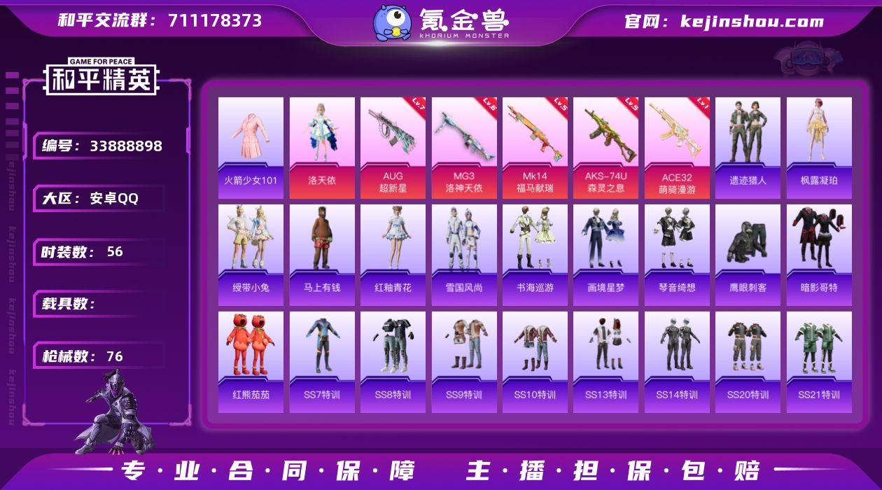 安卓手Q-1粉装-5特效枪-25577热力值-4王牌印记-56套装-76枪皮 【热门品类】:套装-火箭少女101,套装-暗影哥特,套装-红熊茄茄 【粉色套装】:角色-洛天依 【粉色枪皮等级】:AUG-超新星(七级),ACE32-萌骑漫游(一级),AKS-74U-森灵之息(五级),Mk14-福马献瑞(五级),MG3-洛神天依(六级) 【粉色枪皮】:AUG-超新星,ACE32-萌骑漫游,AKS-74U-森灵之息,Mk14-福马献瑞,MG3-洛神天依 【粉色降落伞】:洛神天依降落伞,无垠阁降落伞 【稀有套装】:套装-雪国风尚,套装-马上有钱,套装-遗迹猎人,套装-书海巡游,套装-画境星梦,套装-琴音绮想,套装-雨过天青,套装-红釉青花,套装-绶带小兔,角色-枫露凝珀 【稀有枪皮】:AKM-夜灯,AKM-影袭,AKM-破晓战魂,SCAR-L-生命誓言,SCAR-L-绶带小兔,M416-蓝色火焰,GROZA-2B战斗服款,GROZA-影袭,AUG-2P战斗服款,AUG-甜蜜菠萝,QBZ-洛神天依,M762-绯红前夜,Mk47-洛神天依,AC-VAL-彩虹甜喵,ACE32-画境星梦,UZI-影袭,UMP45-生命誓言,Vector-彩虹符号,汤姆逊-像素花束,MP5K-画境星梦,Kar98K-幻影战神,Kar98K-彩虹符号,Kar98K-洛神天依,Kar98K-红色方程式,M24-影袭,AWM-暮色玫影,MK20-H-绶带小兔,M1加兰德-画境星梦...