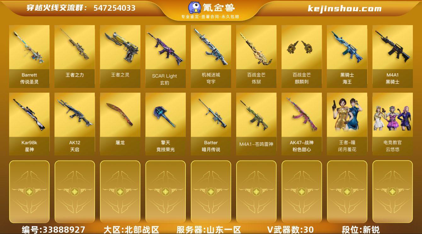 【961045】山东一区-31V-6王者武器数-0炫金武器数 【传说武器】:传说圣灵 【热门武器】:传说圣灵,Kar98K-星神,M4A1-黑骑士,羊驼玩偶 【王者炫金武器】:王者之力,王者之灵,高爆手雷-雷霆王者*2,烟雾弹-雷霆王者,闪光弹-雷霆王者 【音效卡】:M4A1-黑骑士音效卡,炼狱-百战金芒-庆典舞曲音效卡 【皮肤】:M4A1-再燃火线,战神-粉色甜心皮肤*2,轻型军用手斧-再燃火线,炽芒蝶刃-巅峰荣耀 皮肤 【角色】:电竞教官-云悠悠,王者-瞳-闭月羞花,葵-阿尔法武装,初恋灵狐,芳心审判者,麻雀,潘多拉-甜心教官,潜龙队-X,雪莉杨-摸金校尉 【人偶武器】:迷你裂空之翼,迷你牛牛,生化手雷-机甲核心 【挑战大师】:神圣爆裂者III,冰龙粉碎者-白马银枪 【英雄级武器】:M4A1-黑骑士,AK12-天启,SCAR Light-玄豹,黑骑士-海王,机械迷城-穹宇,Kar98K-星神,Barrett-暗月传说,炼狱-百战金芒,柯尔特-荣耀世冠EP,屠龙,擎天-竞技荣光*2,麒麟刺-百战金芒,高爆手雷-竞技荣光*2,高爆手雷-玄豹,闪光弹-竞技荣光*2,闪光弹-玄豹,烟雾弹-竞技荣光*5,烟雾弹-荣耀世冠EP,M4A1-苍鸣雷神 【其他武器】:源·火麒麟,源·雷神,魂·雷神-神秘按键,灵·HK417-朱雀-甜蜜火力,源-金...