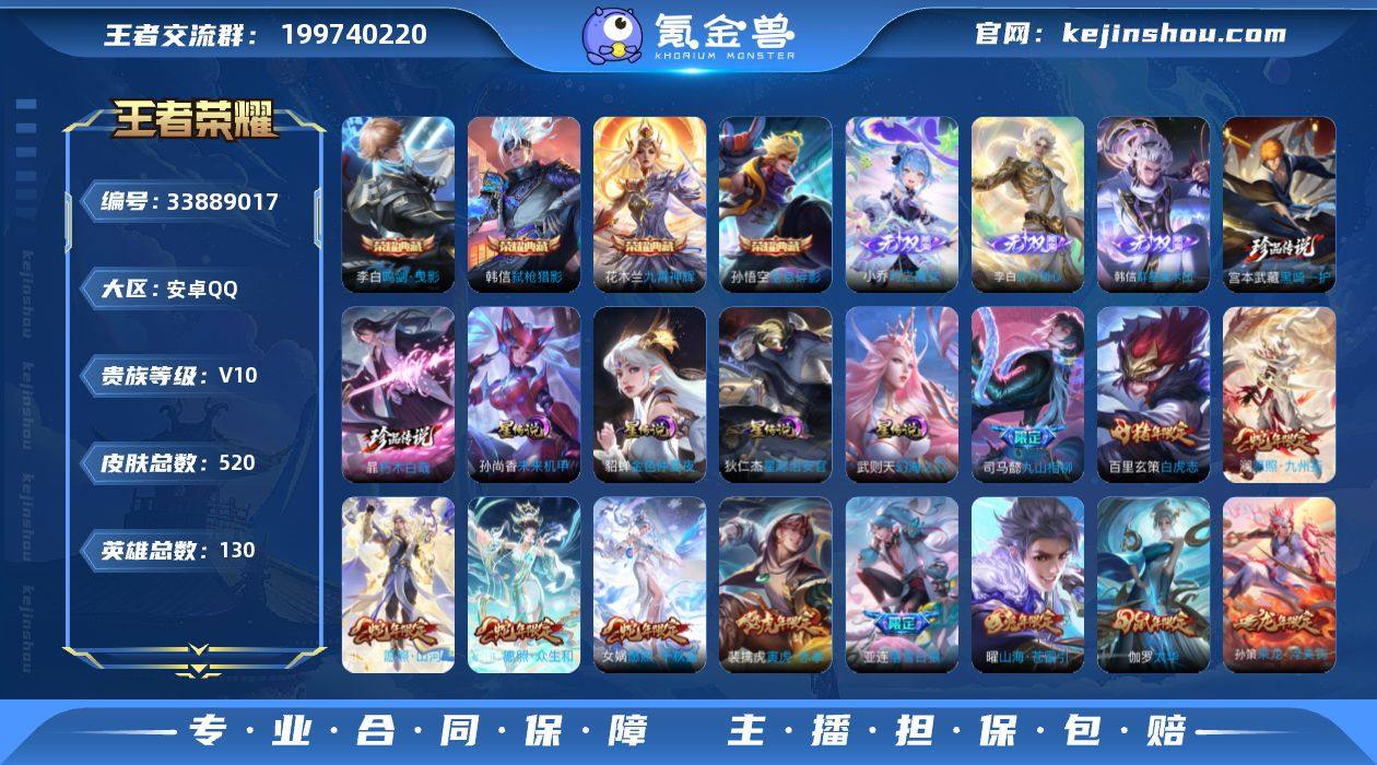 【超高性价比V10·1.1w省4赵云·狸尾假日天幕·弑枪猎影·九霄神辉·鸣剑曳影·全息碎影·武则天·群星魔术团·时之魔女·碎月剑心·朽木白哉·黑崎一护·金色仲夏夜·浮生妄·曦玄引·武圣·落雪白狼·寅虎赤拳·异界灵契·天魔缭乱·时之奇旅·可二次】YXw23817-安卓Q-130英雄-520皮肤-25王者印记-290铭文-贵族积分22w【贵族10】【5典藏·3无双·2珍品·4星传说·51传说·2天幕·13按键·191个性戳戳·233幸运值】【因赛季更新游戏段付以上号为准!】 【英雄全皮】:廉颇全皮,钟无艳全皮,司马懿全皮,刘邦全皮,孙权全皮,牛魔全皮,鬼谷子全皮,黄忠全皮,沈梦溪全皮,狂铁全皮,盾山全皮,敖隐全皮,夏洛特全皮,司空震全皮,戈娅全皮,空空儿全皮,影全皮,海诺全皮 【荣耀典藏】:武则天英雄,孙悟空全息碎影,李白鸣剑曳影,花木兰九霄神辉,韩信弑枪猎影 【无双皮肤】:韩信群星魔术团,小乔时之魔女,李白碎月剑心 【珍品传说】:宫本武藏黑崎一护,暃朽木白哉 【星元皮肤】:貂蝉金色仲夏夜,武则天幻海之心,孙尚香未来机甲,狄仁杰星际治安官 【天幕】:共赏芳华天幕,狸尾假日天幕 【传说皮肤】:司马懿九山相柳,杨玉环星之鸣奏,司空震愿照山河定,女娲愿照千秋盛,妲己愿照众生和,澜愿照九...
