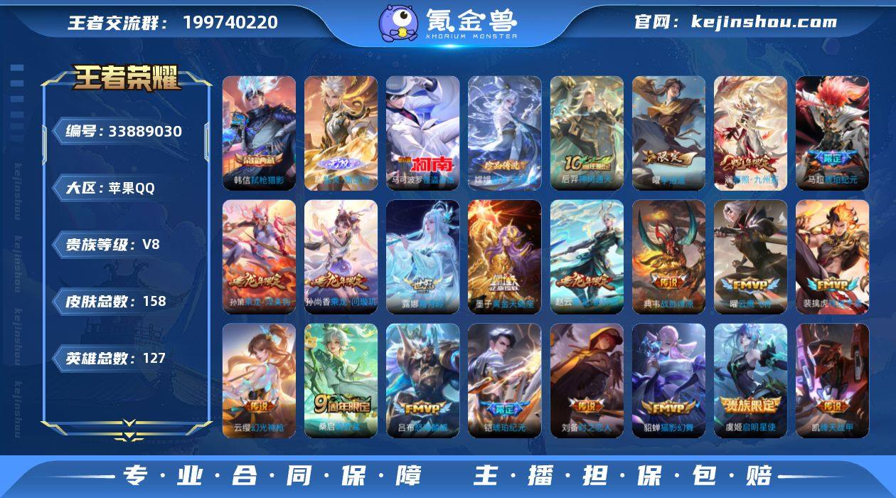 苹果Q-V8-永恒钻石I段位-127英雄-158皮肤-1典藏皮肤-1无双-2珍品传说-20传说-44史诗【英雄全皮】:影全皮【荣耀典藏】:韩信弑枪猎影【无双皮肤】:曜器灵螭龙剑【珍品传说】:嫦娥器灵落星盏,马可波罗怪盗基德【传说皮肤】:后羿神树通天,澜愿照九州拓,云缨幻光神枪,裴擒虎祥瑞亨通,桑启鸣野蒿,墨子黄金天蝎座,典韦战鼓燎原,孙尚香乘龙问璇玑,孙策乘龙淬吴钩,赵云乘龙铭钟鼎,马超琥珀纪元,铠琥珀纪元,露娜霜月吟,吕布怒海麟威,曜李逍遥 ,铠绛天战甲,虞姬启明星使,曜云鹰飞将,刘备时之恋人,貂蝉猫影幻舞【限定皮肤】:狄仁杰阴阳师,赵云皇家上将,狄仁杰魔术师,项羽海滩派对,孙悟空孙行者,虞姬启明星使,黄忠烈魂,云中君纤云弄巧,曜李逍遥 ,鲁班大师探海日志,艾琳女武神,张良古海寻踪,蒙犽百解令,高渐离燃音魔法,妲己灵卜魔法,鬼谷子天穹祈灯,伽罗琥珀纪元,铠琥珀纪元,马超琥珀纪元,孙尚香乘龙问璇玑,孙策乘龙淬吴钩,赵云乘龙铭钟鼎,百里玄策超元猎域,沈梦溪龙舞盛年,曹操夜都魔契,鲁班七号蔬乡物语,李元芳蔬乡物语,刘邦剑破天穹,程咬金群星魔术团,镜青焰无极,项羽苍威无极,芈月浮光幕影,周瑜熔金海岸【年限皮肤】:孙尚香...