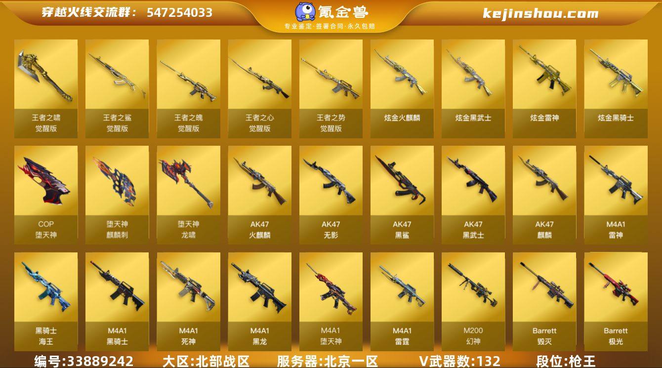 【946722】北京一区-143V-5王者武器数-4炫金武器数 【热门武器】:QBZ03-金色蔷薇,M200-幻神,M200-竞技荣光,Kar98K-星神,M4A1-黑骑士*3,汤姆逊-烈龙*3,RPK-盘龙,加特林-炼狱,裁决-雪莉杨,COP-堕天神*2,沙鹰-修罗*2 【王者炫金武器】:炫金火麒麟,炫金骑士,炫金雷神,炫金武士 【音效卡】:AK47-火麒麟音效卡,M4A1-雷神音效卡,M4A1-黑骑士音效卡,Barrett-毁灭音效卡 【皮肤】:裁决-星际旅行 皮肤,烈龙-星空,雷神-暗月,雷神-星空,雷神-虎将,火麒麟-雷神,火麒麟-平天大圣,毁灭耀金皮肤,毁灭-星空,黑龙-能量核心,黑龙-暗月,M4A1-黑龙-361,无影耀金皮肤,AK47-黑武士-361,天龙-能量核心,AWM-天龙-传奇白鲨,极光-能量核心,修罗-能量核心 【角色】:零,葵,炫,迷迭香,电竞教官-云悠悠,审判者,斗烈龙骑,兰-海滩派对,兰-新年限定,零-水下丽影,灵狐者-X,灵狐者-黄金海岸,龙儿,潘多拉-X,青霞仙子,蜀雪,兔囡囡,新娜塔莎,樱-缤纷夏日,团团,雅典娜 【人偶武器】:裁决-雪莉杨,M4A1-雷神-精英刀锋,巴雷特-零-水下丽影,灵狐娃娃手雷*2 【暴走生化】:超级对讲机 【挑战大师】:AK47-冰龙粉碎者 【英雄级武器】:AK47-火麒麟,AK47-麒麟...