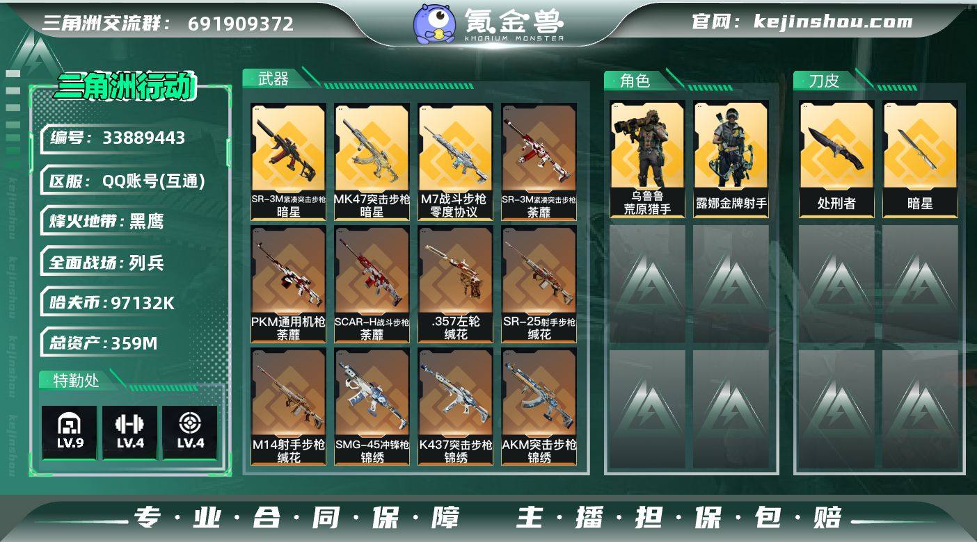 【高额资产号359M.单刀皮暗星.满足烽火/全面战场所有需求.强烈推荐】【Q区三端互通】【无二次】YXz8869-特勤处:仓库9级/靶场4级/训练中心4级-总资产360m-哈夫币9713w-烽火等级:60级 【干员外观】:露娜-金牌射手,乌鲁鲁-荒原猎手 【近战皮肤】:近战-暗星,近战-处刑者1级,近战-黑鹰 【传说外观】:AKM突击步枪-锦绣,K416突击步枪-行动记录,M7战斗步枪-零度协议,SG552突击步枪-运动员,SCAR-H战斗步枪-荼蘼,K437突击步枪-锦绣,MK47突击步枪-暗星,SMG-45冲锋枪-锦绣,SR-3M紧凑突击步枪-暗星,SR-3M紧凑突击步枪-荼蘼,PKM通用机枪-荼蘼,M14射手步枪-蛮荒,M14射手步枪-缄花,SR-25射手步枪-缄花,.357左轮-缄花 【史诗外观】:K416突击步枪-冬日风情,K416突击步枪-腊梅,M7战斗步枪-百步穿杨,SG552突击步枪-哈夫克警备,G3战斗步枪-流沙送葬,AS Val突击步枪-百步穿杨,腾龙突击步枪-猎鳄行动,K437突击步枪-丛影谍踪,MP5冲锋枪-竞技风,Vector冲锋枪-猎鳄行动,Vector冲锋枪-百步穿杨,Vector冲锋枪-异域战争,SMG-45冲锋枪-阿萨拉特攻,SR-3M紧凑突击步枪-开工大吉,勇士冲锋枪-丛影谍踪,MP7冲锋枪-六套之力,S12K霰弹枪-曙光,PKM通用机枪-蝮蛇,M249轻机枪...
