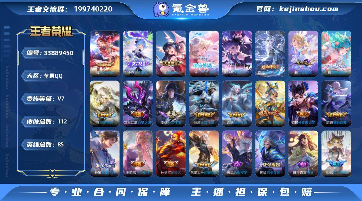 【WZYH1225】贵族等级7/荣耀典藏数量1/传说皮肤数量14/史诗皮肤数量30/皮肤数量112/英雄数量85/段位最强王者/影全皮/瑶-拾光映像/小乔-时之魔女/瑶-真我赫兹/瑶-时之愿境/西施游龙堇华/安琪拉酷洛米之心/瑶-大耳狗之梦/嫦娥-器灵·落星盏/貂蝉神骥聚万邦/东皇太一-灼幽烈阳/小乔-山海·琳琅生/马超-无双飞将/孙策-挚爱之约/瑶-时之祈愿/王昭君-乞巧织情/西施-游龙清影/镜-炽阳神光/李信-一念神魔/貂蝉-猫影幻舞/貂蝉-仲夏夜之梦/宫本武藏-地狱之眼/孙悟空-地狱火/狄仁杰-阴阳师/赵云-皇家上将/妲己-时之彼端/狄仁杰-魔术师/项羽-海滩派对/蔡文姬-奇迹圣诞/百里玄策-原初追逐者/西施-玲珑珍味/太乙真人-谧流熔炉/钟馗虚灵犬护/甄姬逆浪荇歌/亚瑟荣光之誓/项羽九幽镇关/百相守梦-周瑜/百相守梦-孙策/周瑜线条小狗/小乔线条小狗/米莱狄青瓷雀吟/后羿天穹守望者/海月海之女神/明世隐百晓客/少司缘巫礼祀神/女娲万灵启世/西施织梦人/百相守梦-黄忠/弈星-万物之道/杨玉环-银翎春语/蒙犽-龙鼓争鸣/西施-诗语江南/瑶-遇见神鹿/小乔-青蛇/娜可露露-晚萤/狄仁杰-鹰眼统帅/大乔-猫狗日记/花木兰-水晶猎龙者/妲己-魅力维加斯/孙尚香-水果甜心/王昭君-偶像歌手/甄姬-冰雪圆舞曲/貂蝉-圣诞恋歌...