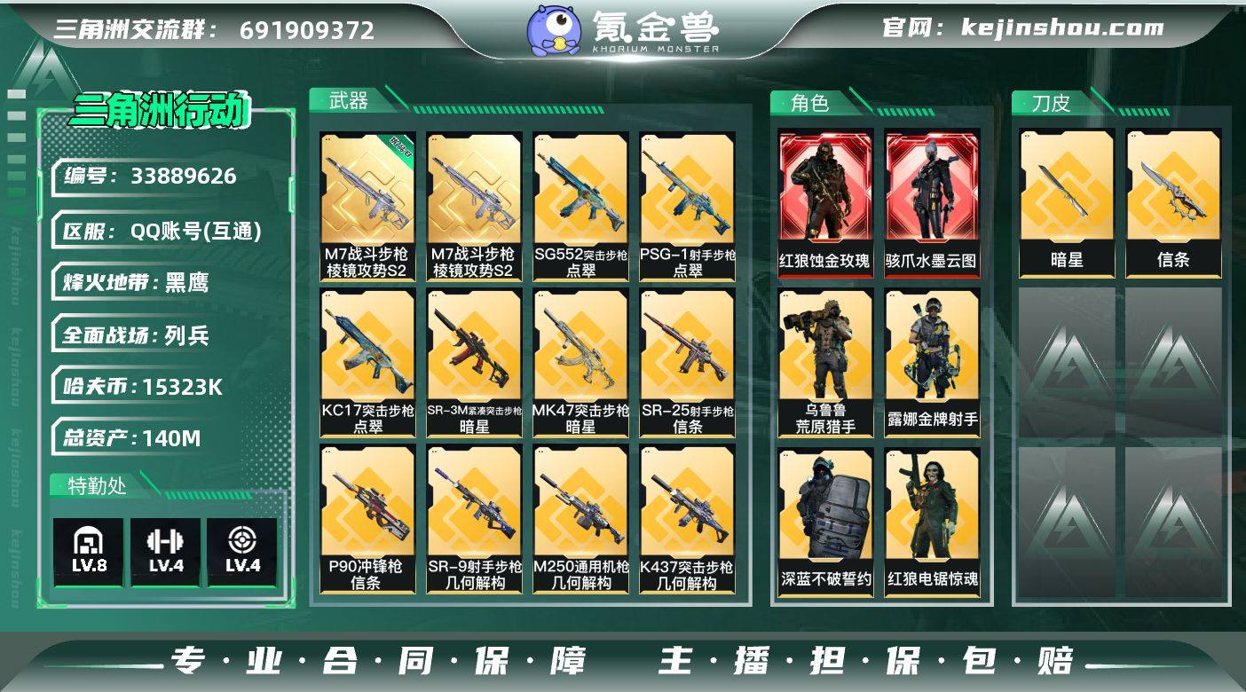 【热门皮肤号:双红+双刀+单典藏皮肤】【Q区三端互通】【可二次】YXz6442-特勤处:仓库8级/靶场4级/训练中心4级-总资产140m-哈夫币1532w-烽火等级:60级 【干员外观】:红狼-蚀金玫瑰,骇爪-水墨云图,蜂医-送葬人·无题密令,深蓝-不破誓约,红狼-电锯惊魂,露娜-金牌射手,乌鲁鲁-荒原猎手 【近战皮肤】:近战-暗星,近战-信条,近战-黑鹰 【典藏外观】:M7战斗步枪-棱镜攻势S2 【典藏外观成色】:M7战斗步枪-棱镜攻势S2(优品B) 【传说外观】:M4A1突击步枪-蚀金玫瑰,M4A1突击步枪-阿米娅,AKM突击步枪-锦绣,ASh-12战斗步枪-鹅鸭杀,M7战斗步枪-零度协议,SG552突击步枪-运动员,SG552突击步枪-点翠,AK-12突击步枪-特斯拉线圈,SCAR-H战斗步枪-水墨云图,SCAR-H战斗步枪-启航,G3战斗步枪-骑士,CAR-15突击步枪-阿米娅,腾龙突击步枪-捞点薯条,腾龙突击步枪-马年祥瑞,腾龙突击步枪-万金泪冠,K437突击步枪-几何解构,KC17突击步枪-电锯惊魂,KC17突击步枪-点翠,MK47突击步枪-暗星,P90冲锋枪-信条,Vector冲锋枪-能天使-午夜邮差,UZI冲锋枪-特斯拉线圈,SR-3M紧凑突击步枪-特斯拉线圈,SR-3M紧凑突击步枪-暗星,勇士冲锋枪-能天使-午夜邮差,QCQ171冲锋枪-鹅鸭杀,725...