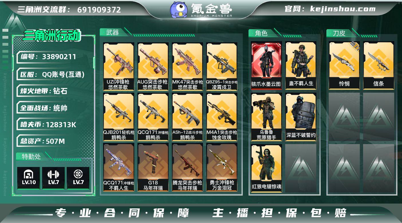 【高氪金土豪号:单红+三刀.总资产507M】【Q区三端互通】【无二次】YXz9481-特勤处:仓库10级/靶场7级/训练中心7级-总资产507m-哈夫币128m-烽火等级:60级 【干员外观】:骇爪-水墨云图,深蓝-不破誓约,红狼-电锯惊魂,乌鲁鲁-荒原猎手,蛊-不羁人生 【近战皮肤】:近战-信条,近战-怜悯,近战-处刑者2级,近战-黑鹰 【传说外观】:M4A1突击步枪-蚀金玫瑰,M4A1突击步枪-阿米娅,AKM突击步枪-锦绣,QBZ95-1突击步枪-凌霄戍卫,ASh-12战斗步枪-鹅鸭杀,K416突击步枪-行动记录,M16A4突击步枪-狩猎时刻,AUG突击步枪-悠然茶歇,AK-12突击步枪-特斯拉线圈,SCAR-H战斗步枪-水墨云图,SCAR-H战斗步枪-启航,G3战斗步枪-狩猎时刻,G3战斗步枪-骑士,CAR-15突击步枪-阿米娅,腾龙突击步枪-马年祥瑞,腾龙突击步枪-万金泪冠,K437突击步枪-锦绣,KC17突击步枪-电锯惊魂,MK47突击步枪-悠然茶歇,Vector冲锋枪-狩猎时刻,UZI冲锋枪-特斯拉线圈,UZI冲锋枪-悠然茶歇,SMG-45冲锋枪-锦绣,SR-3M紧凑突击步枪-特斯拉线圈,勇士冲锋枪-能天使-午夜邮差,勇士冲锋枪-万金泪冠,QCQ171冲锋枪-鹅鸭杀,QCQ171冲锋枪-不羁人生,M250通用机枪-骑士之心,QJB201轻机枪-鹅鸭杀,M14射手步枪-蛮荒...