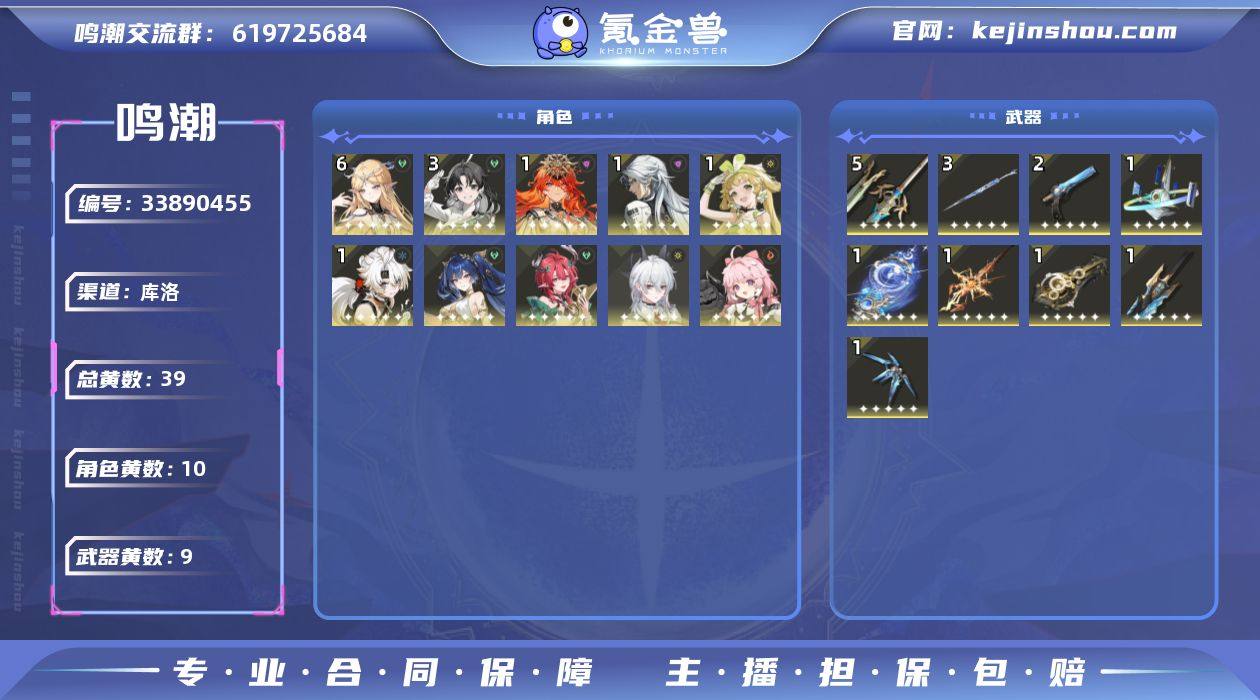 男/女主: 男主 总黄数: 39 联觉等级: 77 拥有五星共鸣者: 鉴心,卡卡罗,安可,维里奈,凌阳,赞妮,夏空,卡提希娅,奥古斯塔,尤诺 6鸣五星共鸣者: 6鸣卡提希娅 3鸣五星共鸣者: 3鸣鉴心 1鸣五星共鸣者: 1鸣卡卡罗,1鸣维里奈,1鸣凌阳,1鸣奥古斯塔 0鸣五星共鸣者: 0鸣安可,0鸣赞妮,0鸣夏空,0鸣尤诺 拥有五星武器: 浩境粼光,停驻之烟,漪澜浮录,血誓盟约,焰光裁定,不屈命定之冠,驭冕铸雷之权,万物持存的注释,玻色星仪 5鸣五星武器: 5鸣血誓盟约 3鸣五星武器: 3鸣不屈命定之冠 2鸣五星武器: 2鸣停驻之烟 1鸣五星武器: 1鸣浩境粼光,1鸣漪澜浮录,1鸣焰光裁定,1鸣驭冕铸雷之权,1鸣万物持存的注释,1鸣玻色星仪 亮点: 【MC382】77级/39黄/男主/10个五星角色/9个五星武器未绑定,赞妮,夏空,卡提希娅,奥古斯塔,尤诺,维里奈,卡卡罗,鉴心,安可,凌阳,玻色星仪,万物持存的注释,驭冕铸雷之权,不屈命定之冠,焰光裁定,血誓盟约,浩境粼光,停驻之烟,漪澜浮录,满命卡提希娅,3命鉴心,1命奥古斯塔,1命维里奈,1命卡卡罗,1命凌阳,0命赞妮,0命夏空,0命尤诺,0命安可,精5血誓盟约,精3不屈命定之冠,精2停驻之烟,精1玻色星仪,精1万物持存的注释,精1驭冕铸雷之权,精1焰光裁定,精1浩境粼光,精1漪澜浮录