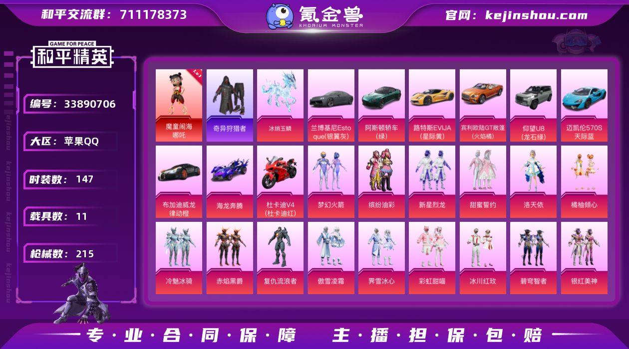 147套装/枪械14/装备272/载具11/战备133/王牌印记9/热力值88256/一级AKM-星际浪客/六级AKM-盖世英雄/五级SCAR-L-锦绣绵绵/三级SCAR-L-魔童闹海 哪吒/七级M416-风花雪月/四级M416-电玩时刻/七级M762-甜蜜誓约/五级Kar98K-巳巳如意/二级AWM-橘柚倾心/四级M249-彩虹甜喵/三级DP-28-豹影疾电/七级MG3-洛神天依/一级MG3-酷泡奶龙/二级PKM-江南烟雨/一级魔童闹海-哪吒/魔童闹海-哪吒/梦幻火箭(新101)/缤纷油彩/奇异狩猎者/军刀雅典娜/龟仙人/暗影哥特/粉红小猪/8号机/Mark.06/新星烈龙/甜蜜誓约/洛天依/橘柚倾心/冷魅冰骑/赤焰黑爵/复仇流浪者/傲雪凌霜/霁雪冰心/彩虹甜喵/冰川红玫/碧穹智者/银红美神/暗夜鎏金/初号机 觉醒Ver./萨利娅/兰博基尼Estoque(银翼灰)/阿斯顿·马丁DBS(绿)/路特斯EVIJA(星际黄)/宾利欧陆GT敞篷(火焰橘)/仰望U8(龙石绿)/迈凯伦570S(天际蓝)/布加迪威龙(律动橙)/海龙奔腾/杜卡迪 Panigale V4(杜卡迪红)/僚机-萌兔起飞/冰绡玉鳞/AKM星际浪客/AKM盖世英雄/SCAR-L-锦绣绵绵/SCAR-L-魔童闹海 哪吒/M416风花雪月/M416电玩时刻/M762甜蜜誓约/Kar98K-巳巳如意/AWM橘柚倾心/M249彩虹甜喵/DP-28-豹影疾电/MG3洛神天依/MG3酷泡奶龙/PKM江南烟雨/飞行器-风花雪月/星际浪...