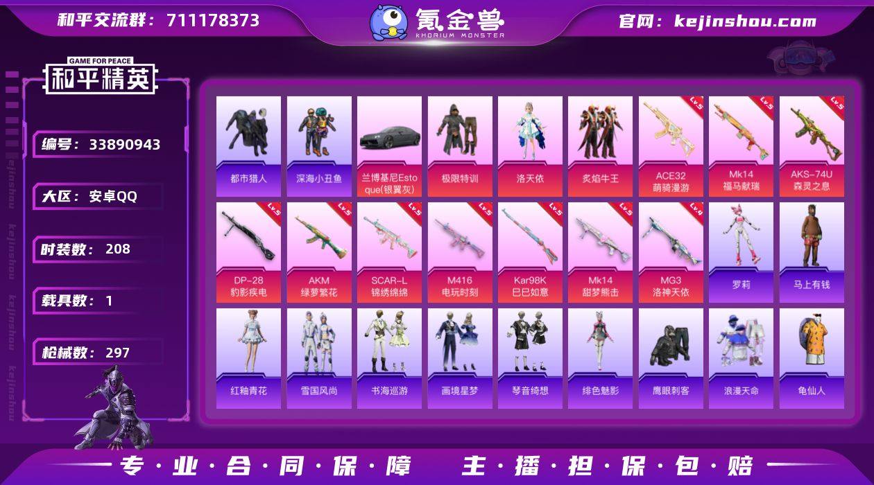 安卓 手Q-3粉装-10特效枪-1载具-1粉色飞行器-81794热力值-23王牌印记-208套装-297枪皮 【热门品类】:套装-浪漫天命,套装-都市猎人,套装-深海小丑鱼,套装-龟仙人,套装-暗影哥特,角色-8号机 【粉色套装】:粉装-极限特训,角色-洛天依,粉装-炙焰牛王 【粉色枪皮等级】:AKM-绿萝繁花(五级),SCAR-L-锦绣绵绵(五级),M416-电玩时刻(五级),ACE32-萌骑漫游(五级),AKS-74U-森灵之息(五级),Kar98K-巳巳如意(五级),Mk14-甜梦熊击(五级),Mk14-福马献瑞(五级),DP-28-豹影疾电(五级),MG3-洛神天依(四级) 【粉色载具】:兰博基尼Estoque(银翼灰) 【粉色枪皮】:AKM-绿萝繁花,SCAR-L-锦绣绵绵,M416-电玩时刻,ACE32-萌骑漫游,AKS-74U-森灵之息,Kar98K-巳巳如意,Mk14-甜梦熊击,Mk14-福马献瑞,DP-28-豹影疾电,MG3-洛神天依 【粉色飞行器】:炫彩糖果飞行器 【粉色降落伞】:极限特训降落伞,洛神天依降落伞,黄族统领降落伞,炫彩糖果降落伞 【稀有套装】:套装-龟仙人,套装-巳巳如意,套装-雪国风尚,套装-炫彩糖果,角色-罗莉,套装-马上有钱,套装-雏菊兔兔,套装-萝兰蝴蝶,套装-小熊娃娃,角色-米开朗基罗,套装-糖糖葫芦,套装-青团波波,套装-燕燕于飞,套装...