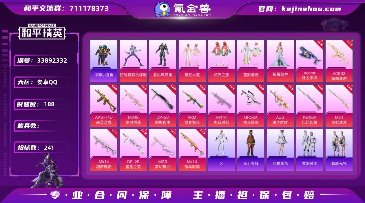 安卓 手Q-6粉装-15特效枪-0载具-1粉色飞行器-73512热力值-6王牌印记-188套装-241枪皮 【热门品类】:套装-深海小丑鱼,套装-小丑鱼,角色-军刀雅典娜,套装-龟仙人,角色-Mark.06 【粉色套装】:角色-初号机款机体服,角色-复仇流浪者,粉装-第五大道,粉装-炫光之旅,粉装-莲影清波,角色-智耀战神 【粉色枪皮等级】:AKM-绿萝繁花(五级),M416-电玩时刻(五级),GROZA-镜光银凌(五级),AUG-暖羊咩咩(五级),ACE32-萌骑漫游(五级),Vector-环太平洋(六级),AKS-74U-森灵之息(五级),Kar98K-巳巳如意(五级),M24-莲影清波(五级),Mk14-甜梦熊击(五级),Mk14-福马献瑞(四级),M249-绝对恒星(五级),DP-28-圣堂之誓(五级),DP-28-豹影疾电(五级),MG3-梦幻舞会(五级) 【粉色枪皮】:AKM-绿萝繁花,M416-电玩时刻,GROZA-镜光银凌,AUG-暖羊咩咩,ACE32-萌骑漫游,Vector-环太平洋,AKS-74U-森灵之息,Kar98K-巳巳如意,M24-莲影清波,Mk14-甜梦熊击,Mk14-福马献瑞,M249-绝对恒星,DP-28-圣堂之誓,DP-28-豹影疾电,MG3-梦幻舞会 【粉色飞行器】:炫彩糖果飞行器 【粉色降落伞】:星之彼岸降落伞,环太平洋降落伞,天星战神降落伞,炫光之旅降落伞,圣堂之誓降落伞,星梦奇缘降...