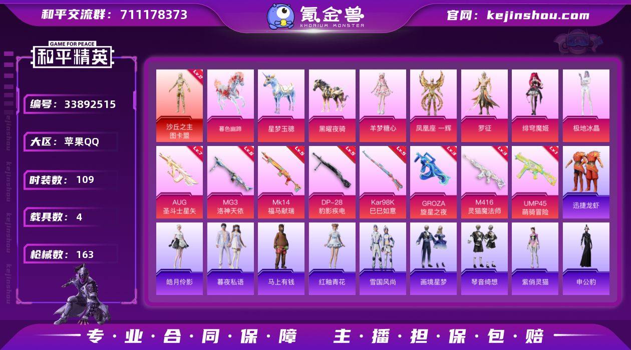 【LHPX1997】【特价出售/店主推荐】苹果 手Q-1神装-5粉装-8特效枪-4载具-8粉色飞行器-53578热力值-6王牌印记-109套装-163枪皮【红色神装等级】:沙丘之主-图卡盟(二级)【热门品类】:熔岩游骑兵连帽夹克【粉色套装】:角色-凤凰座 一辉,角色-罗征,角色-绯穹魔姬,角色-羊梦糖心,角色-极地冰晶【粉色枪皮等级】:M416-灵猫魔法师(三级),GROZA-旋星之夜(三级),AUG-圣斗士星矢(七级),UMP45-萌骑冒险(一级),Kar98K-巳巳如意(五级),Mk14-福马献瑞(五级),DP-28-豹影疾电(五级),MG3-洛神天依(六级)【粉色载具】:僚机-圣域龙宝,星梦玉骢,黑曜夜骑,暮色幽蹄【粉色枪皮】:M416-灵猫魔法师,GROZA-旋星之夜,AUG-圣斗士星矢,UMP45-萌骑冒险,Kar98K-巳巳如意,Mk14-福马献瑞,DP-28-豹影疾电,MG3-洛神天依【粉色飞行器】:香车宝马飞行器,炫彩糖果飞行器,沙丘之主天马,幻海精灵飞行器,圣域金龙飞行器,灵猫魔法师飞行器,飞天猪飞行器