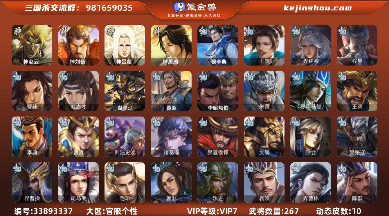 VIP等级: VIP7 官阶: 骠骑将军 武将数量: 267 动态皮肤数量: 10 神将: 神刘备,神赵云,神吕蒙,神周瑜 魏国武将: 戏志才,曹纯,程昱,界钟会,王粲,张辽,SP曹仁,SP关羽,SP贾诩,SP姜维,卞夫人,曹昂,曹操,曹冲,曹洪,曹丕,曹仁,曹叡,王异,张恭,鲁芝,界满宠,曹休,界曹植,满宠,荀攸,王基,钟繇,郭嘉,牵招,荀彧,阮慧,杜畿,崔琰,界荀彧,朱灵,界甄姬,吕虔,界王异,陈群,界曹休,袁涣,乐进,郭淮,毛玠,夏侯惇,曹植,司马朗,界曹操,许褚,界张辽,钟会,文聘,曹彰,界夏侯惇,诸葛诞,司马懿,甄姬,徐晃,韩浩史涣,曹真,典韦,夏侯渊,李典,于禁,王双,邓艾,界司马懿,朱灵(国战),李昭焦伯,董昭,谋张辽,骥李典 蜀国武将: 王平,张星彩,谋马超,谋赵云,徐庶,吕凯,界关羽,界诸葛亮,费祎,界黄月英,赵云,张松,彭羕,界刘备,谋姜维,刘封,糜竺,黄月英,关羽,王甫赵累,吴懿,吴班,祝融,张飞,黄皓,魏延,界周仓,界法正,糜夫人,刘禅,界赵云,关银屏,界祝融,SP孙尚香,SP徐庶,卧龙诸葛,周仓,简雍,谋孟获,界关兴张苞,诸葛亮,法正,陈到,界马岱,关平,马岱,界庞统,庞统,诸葛果,谋张飞,马谡,马超,霍峻,廖化,关兴张苞,谋关羽,孟获,黄忠,刘备,界马超,马良,彭羕(国战),甘夫人,蜀-糜芳傅士仁,SP甘夫人,势陈祗 吴国武将: 界徐盛,界朱然,周处...
