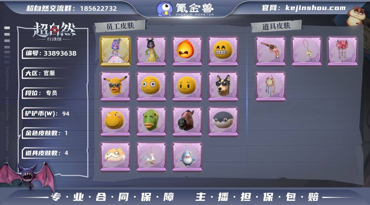 ZR105,金皮:1,紫皮:1,道具皮:4,外观:小黄-遗失的童话,小黄-呱呱雨衣,道具:额外的背包-飞花令,转轮手枪-新星时代,摸金符-紫霄,音响-鸣沙鼓,员工:小黄,爱丽丝,零,逍遥,薇薇安,巫铃儿,莉莉,爱德华,动作:luvaboy,心跳摇,举牌,抬手,头饰:鱼头怪头套,烈焰红唇头套,大葱明头套,火爆了头套,面具马头套,哈士奇头套,萨卡班甲鱼头套,嘻嘻头套,滑稽头套,呆滞头套,卑微头套,小狗蛇点点头套,后室幸存者头套,挂饰:九色祥鹿,小鲨包包,赛季魔盒:普通魔盒,累充:6240金砖,段位:专员,铲铲币:94w