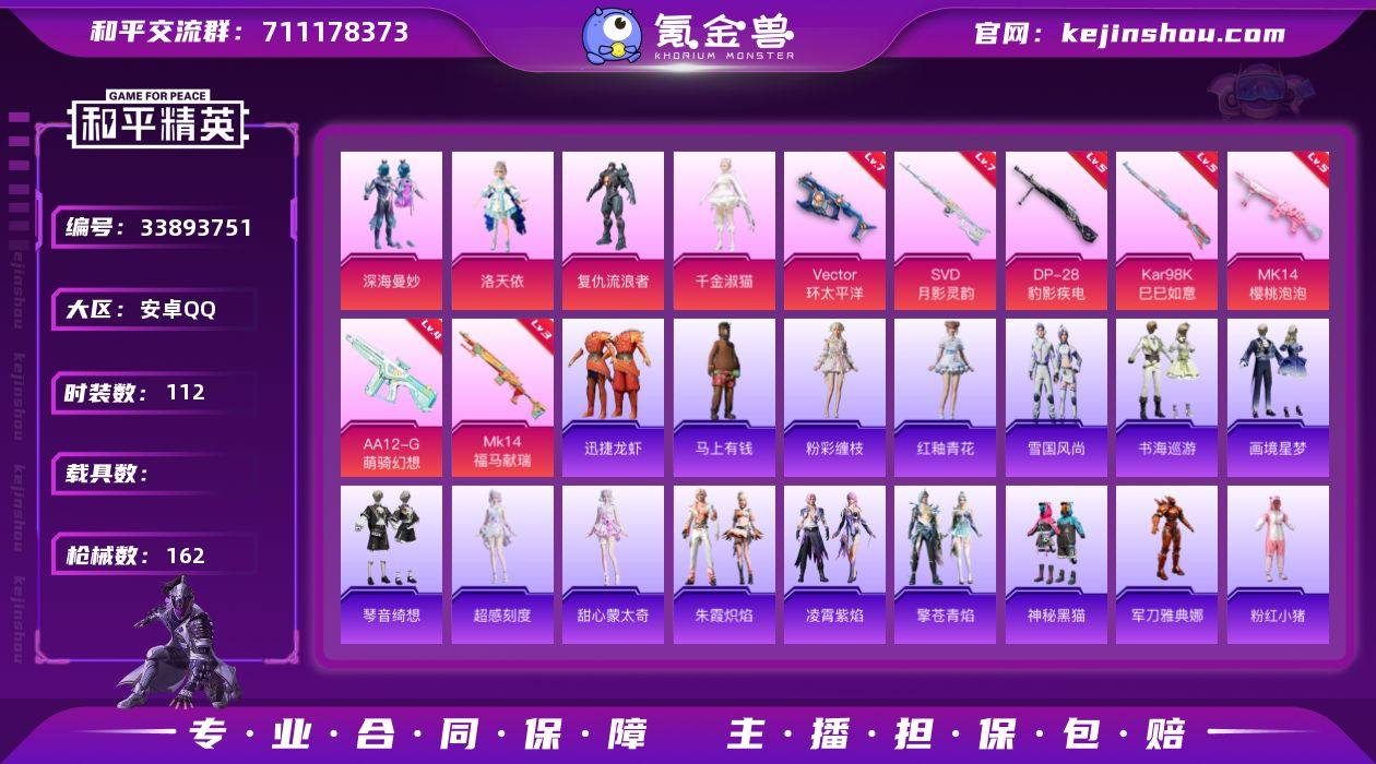 【kyhp1384】安卓 手Q-4粉装-7特效枪-0载具-2粉色飞行器-46921热力值-6王牌印记-112套装-162枪皮 【热门品类】:角色-军刀雅典娜,套装-粉红小猪 【粉色套装】:粉装-深海曼妙,角色-洛天依,角色-复仇流浪者,角色-千金淑猫 【粉色枪皮等级】:Vector-环太平洋(七级),Kar98K-巳巳如意(五级),Mk14-樱桃泡泡(五级),Mk14-福马献瑞(三级),SVD-月影灵韵(七级),AA12-G-萌骑幻想(四级),DP-28-豹影疾电(五级) 【粉色枪皮】:Vector-环太平洋,Kar98K-巳巳如意,Mk14-樱桃泡泡,Mk14-福马献瑞,SVD-月影灵韵,AA12-G-萌骑幻想,DP-28-豹影疾电 【粉色飞行器】:绝对恒星飞行器,炫彩糖果飞行器 【粉色降落伞】:绝对恒星降落伞,PEL轰鸣竞梦者降落伞,古堡领主降落伞,洛神天依降落伞,环太平洋降落伞,月影灵韵降落伞,樱桃泡泡降落伞,喜羊羊与灰太狼降落伞,炫彩糖果降落伞 【稀有套装】:套装-巳巳如意,角色-超感刻度,角色-甜心蒙太奇,套装-雪国风尚,套装-炫彩糖果,套装-马上有钱,套装-迅捷龙虾,角色-都市丽猫,套装-燕燕于飞,套装-鱼渊荷华,角色-蜜桃派对,套装-粉恋花,套装-紫幽梦,套装-蓝冰羽,套装-彩虹兔,套装-云朵鹅,套装-雪绒豹,套装-朱霞炽焰,套装-...