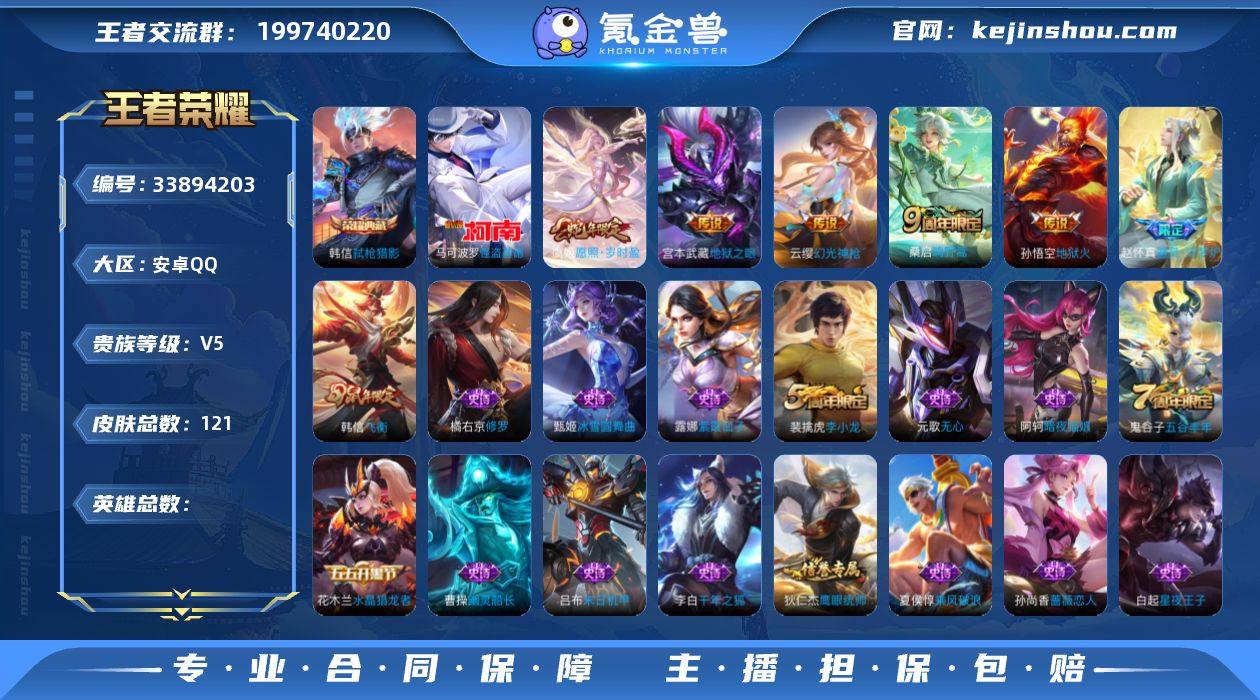 V5 1典藏 1珍品 5传说 121皮肤 【1水晶】韩信-弑枪猎影【1珍品传说】马可波罗-怪盗基德【5传说】宫本武藏-地狱之眼,孙悟空-地狱火,桑启-鸣野蒿,云缨-幻光神枪,虞姬-愿照·岁时盈【31史诗】元歌-无心,鬼谷子-五谷丰年,赵云-未来纪元,阿轲-暗夜猫娘,阿轲-节奏热浪,白起-星夜王子,百里守约-特工魅影,曹操-幽灵船长,程咬金-功夫厨神,狄仁杰-鹰眼统帅,宫本武藏-鬼剑武藏,韩信-飞衡,花木兰-水晶猎龙者,橘右京-修罗,李白-千年之狐,李元芳-逐浪之夏,刘邦-德古拉伯爵,露娜-紫霞仙子,吕布-末日机甲,裴擒虎-李小龙,孙尚香-水果甜心,孙尚香-蔷薇恋人,夏侯惇-乘风破浪,小乔-缤纷独角兽,雅典娜-冰冠公主,亚瑟-心灵战警,嬴政-摇滚巨星,张飞-乱世虎臣,赵云-皇家上将,甄姬-冰雪圆舞曲,赵怀真-器灵·浮梦炉