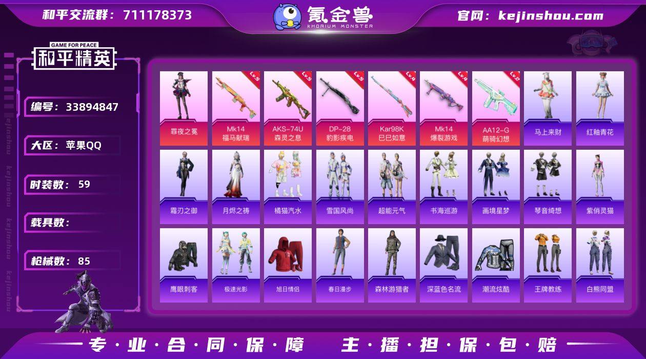 无二次-苹果 手Q-1粉装-6特效枪-0载具-1粉色飞行器-24554热力值-2王牌印记-59套装-85枪皮 【粉色套装】:角色-罪夜之冕 【粉色枪皮等级】:AKS-74U-森灵之息(五级),Kar98K-巳巳如意(四级),Mk14-爆裂游戏(四级),Mk14-福马献瑞(五级),AA12-G-萌骑幻想(二级),DP-28-豹影疾电(五级) 【粉色枪皮】:AKS-74U-森灵之息,Kar98K-巳巳如意,Mk14-爆裂游戏,Mk14-福马献瑞,AA12-G-萌骑幻想,DP-28-豹影疾电 【粉色飞行器】:炫彩糖果飞行器 【粉色降落伞】:绝对恒星降落伞,星梦奇缘降落伞,鬼刀降落伞,异瞳寒姬降落伞,炫彩糖果降落伞,罪夜之冕降落伞 【稀有套装】:套装-超能元气,套装-雪国风尚,套装-炫彩糖果,套装-马上来财,套装-极速光影,角色-紫俏灵猫,套装-书海巡游,套装-画境星梦,套装-琴音绮想,套装-橘猫汽水,角色-霜刃之御,角色-月烬之祷,套装-雨过天青,套装-红釉青花 【稀有枪皮】:AUG-冰晶雪宝,AKM-影袭,AKM-破晓战魂,SCAR-L-炫彩节奏,M416-红色方程式,M416-蓝色火焰,GROZA-影袭,AUG-青春冒险家,M762-彩虹符号,AC-VAL-天降萌叽,ACE32-画境星梦,UZI-影袭,汤姆逊-天降萌叽,汤姆逊-像素花束,MP5K-画境星梦,M24-影袭,SKS-炫彩节奏,M417-...