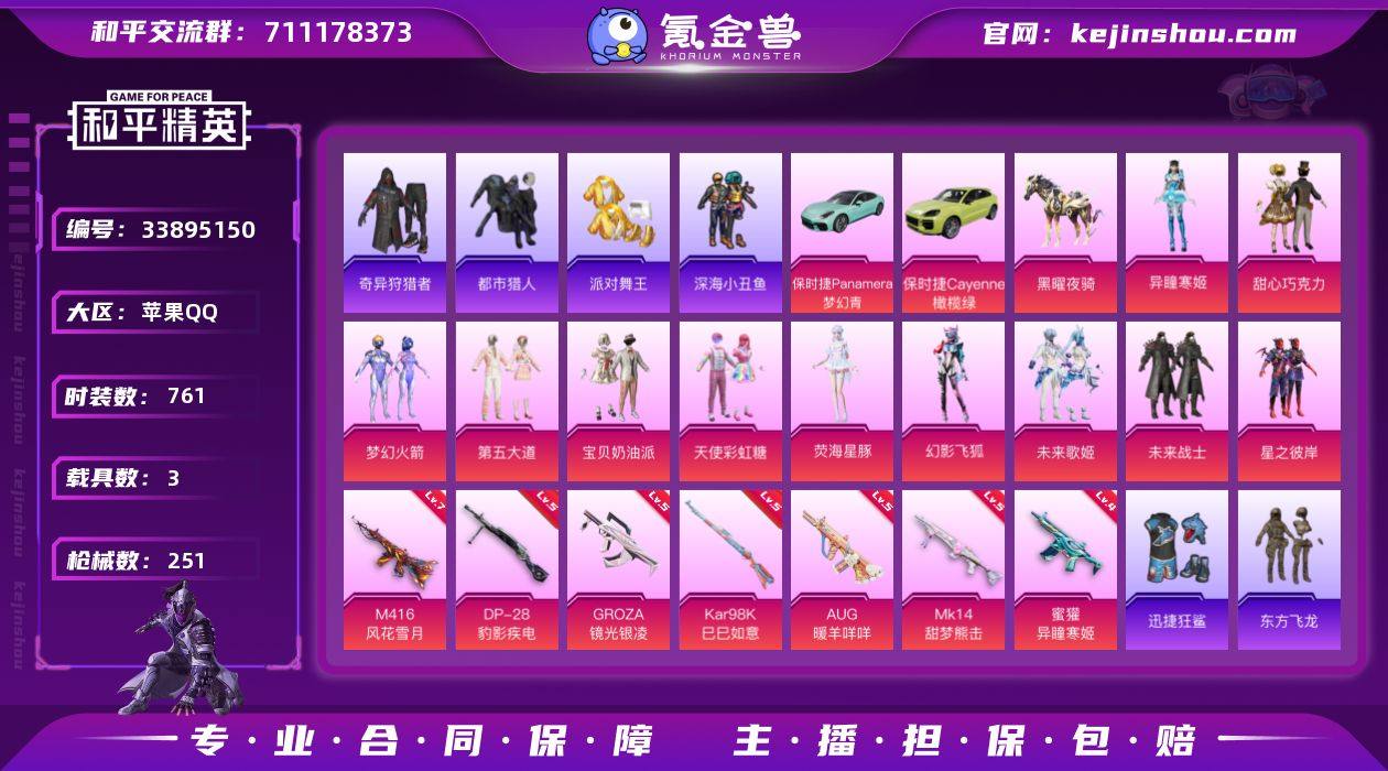 【特价出售】钱包无法注销苹果Q-6稀有3载具11粉装8特效枪16热门194套装251枪皮 78808热力值 9印记 历史卓越王牌14星 【6稀有】 奇异狩猎者 AKM-缤纷海域 都市猎人 浪漫天命 派对舞王 派对舞王(金靴子) 【3载具】 保时捷Cayenne(橄榄绿) 保时捷Panamera(梦幻青) 黑曜夜骑 【11粉装】 梦幻火箭 宝贝奶油派 天使彩虹糖 甜心巧克力 荧海星豚 异瞳寒姬 未来歌姬 幻影飞狐 未来战士 第五大道 星之彼岸 【8特效枪】 Kar98K-巳巳如意 (5级) DP-28-豹影疾电 (5级) AUG-暖羊咩咩 (5级) 蜜獾-异瞳寒姬 (4级) Mk14-甜梦熊击 (5级) GROZA-镜光银凌 (5级) M416-风花雪月 (7级) Mk14-福马献瑞 (5级) 【16热门】 8号机 小丑鱼 东方飞龙 呆萌铁蟹 鹰眼刺客 激萌罗小黑 迅捷狂鲨 深海小丑鱼 AG战队服 暗影哥特 忍者信条 狂沙舞者 漫步者 破蛋小黄鸡 极速红龙 弄潮海豚 【2飞行器】 梦幻火箭飞行器 镜光幻境飞行翼 【5头盔】 国宝胖达头盔 梦幻火箭头盔 甜心宝贝头盔 幻影战神头盔 深海小丑鱼头盔 【6背包】 梦幻火箭背包 甜心宝贝背包 幻影战神背包 萌熊伴侣背包 深海小丑鱼背包 金羽特工背包