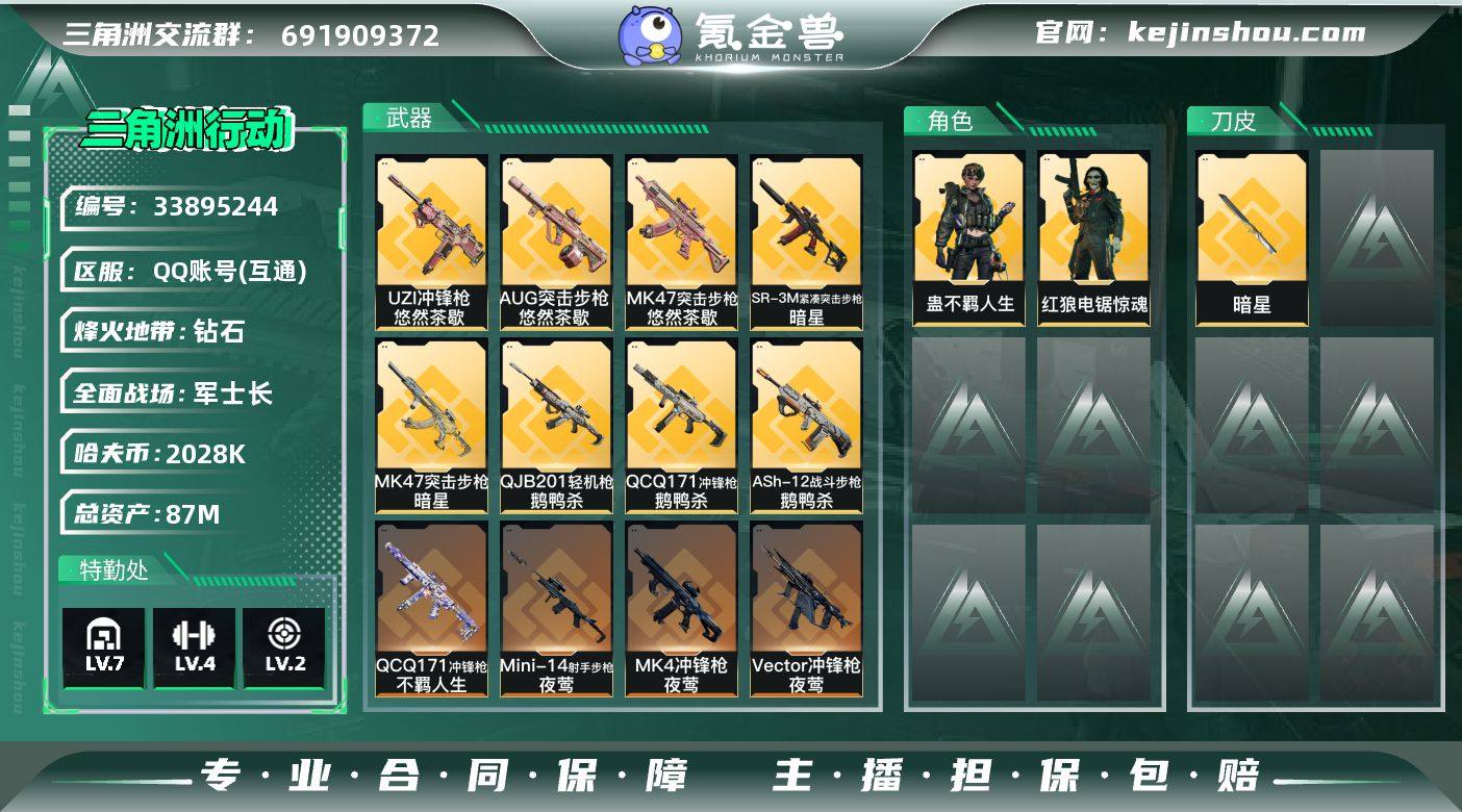 【SJZF8113】总资产87M/哈夫币202万/传说近战数1/传说枪皮数30/战场等级38/行动等级60/安全箱等时效性道具以游戏内数据为准,详情请看图/红狼-电锯惊魂/蛊-不羁人生/近战-暗星/近战-处刑者2级/近战-黑鹰/M4A1突击步枪-阿米娅/ASh-12战斗步枪-鹅鸭杀/K416突击步枪-行动记录/M16A4突击步枪-狩猎时刻/AUG突击步枪-悠然茶歇/AK-12突击步枪-特斯拉线圈/SCAR-H战斗步枪-启航/G3战斗步枪-狩猎时刻/腾龙突击步枪-万金泪冠/KC17突击步枪-电锯惊魂/MK47突击步枪-悠然茶歇/MK47突击步枪-暗星/Vector冲锋枪-狩猎时刻/Vector冲锋枪-能天使-午夜邮差/Vector冲锋枪-夜莺/UZI冲锋枪-特斯拉线圈/UZI冲锋枪-悠然茶歇/SR-3M紧凑突击步枪-特斯拉线圈/SR-3M紧凑突击步枪-暗星/SR-3M紧凑突击步枪-荼蘼/勇士冲锋枪-能天使-午夜邮差/勇士冲锋枪-万金泪冠/QCQ171冲锋枪-鹅鸭杀/QCQ171冲锋枪-不羁人生/MK4冲锋枪-夜莺/QJB201轻机枪-鹅鸭杀/Mini-14射手步枪-夜莺/SKS射手步枪-骑士/AWM狙击步枪-万金泪冠/复合弓-黑-天际线/K416突击步枪-阿萨拉特攻/M16A4突击步枪-竞赛选手/AUG突击步枪-蝮蛇/SG552突击步枪-哈夫克警备/SCAR-H战斗步枪-囚徒/G3战斗步枪-哈夫克警备/腾龙突击步枪-猎鳄行动/MP5冲锋枪-战术竞...