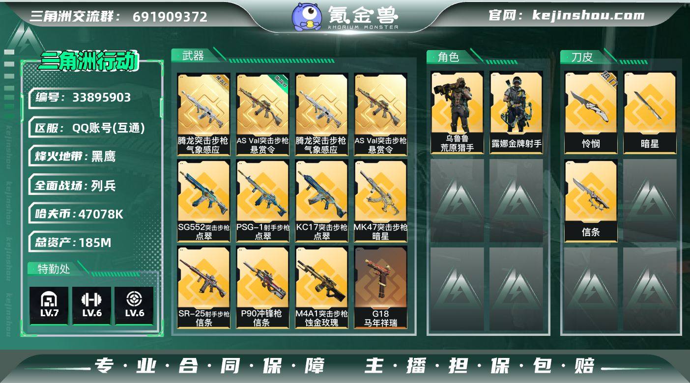 A12292/包人脸/QQ区【总资产:185.5M+腾龙气象感应(极品C/电属性)+腾龙气象感应(极品C/冰属性)+巨浪(优品B)+近战怜悯+近战信条+近战暗星+缄花捆绑包】/烽火等级:60级/全面战场:20级/纯币:47078K/三角券加币:203(三角币15+三角券188)【近战-怜悯/近战-信条/近战-暗星】【乌鲁鲁-荒原猎手/露娜-金牌射手】/部门:22222/特勤等级(技术中心3级/工作台3级/制药台3级/防具台3级/仓库7级/指挥中心5级/训练中心6级/靶场6级/潜水中心2级/收藏室1级)(流动资产:158M)M4A1突击步枪-蚀金玫瑰/MK47突击步枪-暗星/P90冲锋枪-信条/SR-25射手步枪-信条/6橙色挂饰/段位:黑鹰I/详细看图