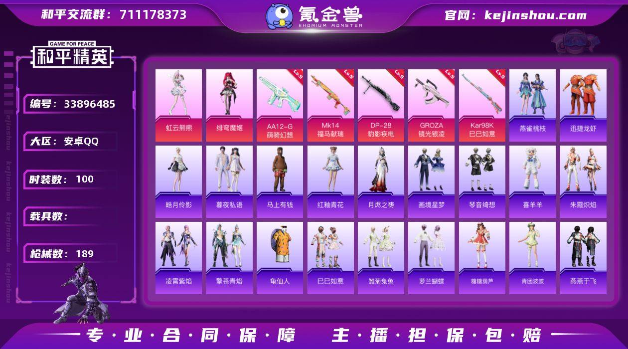 【kyhp1487】安卓 手Q-2粉装-5特效枪-0载具-2粉色飞行器-47535热力值-2王牌印记-100套装-189枪皮 【热门品类】:套装-龟仙人 【粉色套装】:角色-绯穹魔姬,角色-虹云熊熊 【粉色枪皮等级】:GROZA-镜光银凌(五级),Kar98K-巳巳如意(五级),Mk14-福马献瑞(五级),AA12-G-萌骑幻想(五级),DP-28-豹影疾电(五级) 【粉色枪皮】:GROZA-镜光银凌,Kar98K-巳巳如意,Mk14-福马献瑞,AA12-G-萌骑幻想,DP-28-豹影疾电 【粉色飞行器】:炫彩糖果飞行器,极意拳锋飞行器 【粉色降落伞】:江南烟雨降落伞,樱桃泡泡降落伞,幻彩电音降落伞,异瞳寒姬降落伞,炫彩糖果降落伞,虹云熊熊降落伞,鸢尾珑雾降落伞 【稀有套装】:套装-龟仙人,套装-巳巳如意,套装-炫彩糖果,套装-马上有钱,套装-暮夜私语,套装-迅捷龙虾,套装-雏菊兔兔,套装-萝兰蝴蝶,套装-糖糖葫芦,套装-青团波波,套装-燕燕于飞,套装-鱼渊荷华,套装-晶辉守护,角色-糖霜甜心,套装-紫幽梦,套装-蓝冰羽,套装-极速光影,套装-彩虹兔,套装-云朵鹅,套装-雪绒豹,套装-朱霞炽焰,套装-凌霄紫焰,套装-擎苍青焰,玩偶服-喜羊羊,套装-画境星梦,套装-琴音绮想,角色-月烬之祷,套装-雨过天青,套装-红釉青花,角色-皓...