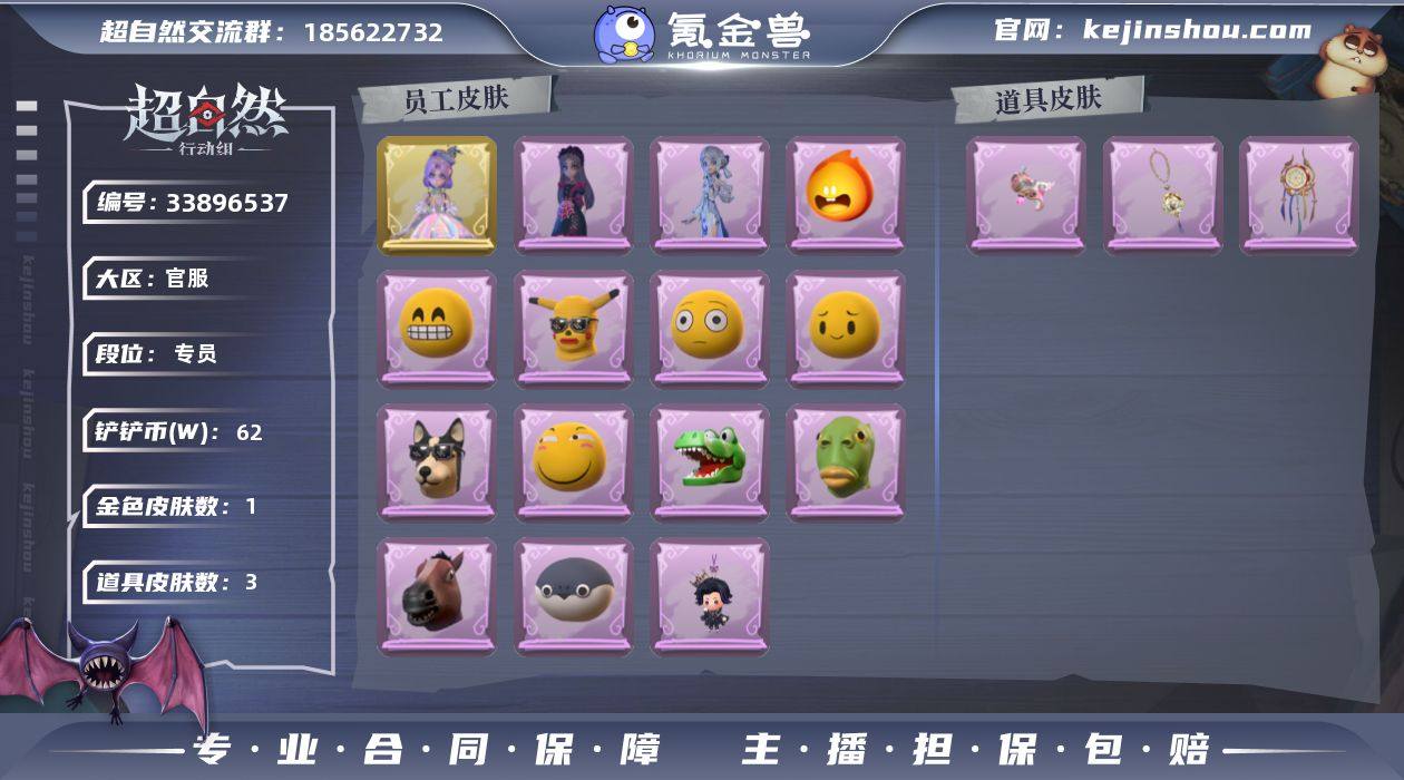 ZR217,金皮:1,紫皮:2,道具皮:3,外观:小黄-遗失的童话,巫铃儿-素影瑶光,爱丽丝-丝缕哀歌,道具:音响-鸣沙鼓,电击枪-甜蜜泡泡枪,摸金符-紫霄,员工:小黄,爱丽丝,零,阿念,逍遥,薇薇安,巫铃儿,莉莉,艾伦,爱德华,兰,头饰:惊魂南瓜头套,鱼头怪头套,烈焰红唇头套,火爆了头套,面具马头套,哈士奇头套,萨卡班甲鱼头套,嘻嘻头套,滑稽头套,呆滞头套,卑微头套,鳄霸天头套,像素朋克墨镜,后室幸存者头套,挂饰:尘封旧事,动作:luvaboy,鸳鸯戏,鹏友摇,舞台中心,举牌,抬手,赛季魔盒:普通魔盒,累充:2060金砖,段位:专员,铲铲币:62w