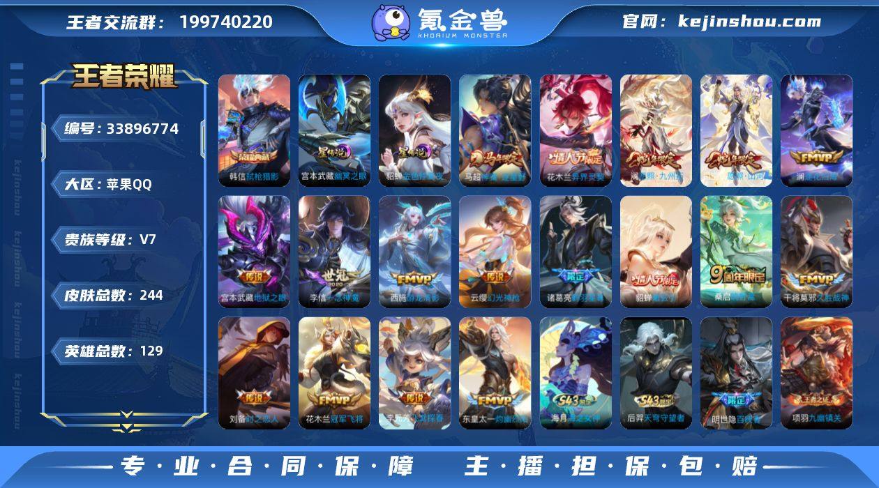 苹果Q-V7-最强王者段位-129英雄-244皮肤-1典藏皮肤-17传说-77史诗 【英雄全皮】:敖隐全皮,司空震全皮,影全皮 【荣耀典藏】:韩信弑枪猎影 【传说皮肤】:马超神骥逐星野,花木兰异界灵契,司空震愿照山河定,澜愿照九州拓,云缨幻光神枪,桑启鸣野蒿,貂蝉曦玄引,澜逐花归海,东皇太一灼幽烈阳,诸葛亮鹤羽星尊,西施游龙清影,李元芳飞鸢探春,李信一念神魔,刘备时之恋人,干将莫邪久胜战神,花木兰冠军飞将,宫本武藏地狱之眼 【限定皮肤】:暃埋骨钱,蒙犽顽岩魄,蔡文姬夏日便利店,大乔绒语心约,虞姬夏日便利店,姜子牙天穹之誓,狄仁杰阴阳师,赵云皇家上将,孙尚香蔷薇恋人,阿轲迷踪丽影,吕布猎兽之王,元歌无心,狄仁杰魔术师,项羽海滩派对,安琪拉魔法小厨娘,亚瑟潮玩骑士王,孙悟空大圣娶亲,钟馗神迹守卫,雅典娜黎明之约,诸葛亮鹤羽星尊,百里玄策原初追逐者,米莱狄胡桃异想国,云中君纤云弄巧,猪八戒西部大镖客,上官婉儿梁祝,艾琳流音漫舞,司空震地狱燃心,张良古海寻踪,蒙犽百解令,高渐离燃音魔法,妲己灵卜魔法,鬼谷子天穹祈灯,伽罗琥珀纪元,貂蝉曦玄引,沈梦溪龙舞盛年,鲁班七号蔬乡物语,李元芳蔬乡物语,刘邦剑破天穹,程咬金群星魔...