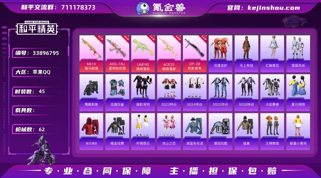 苹果 手Q-0粉装-5特效枪-0载具-0粉色飞行器-15080热力值-1王牌印记-45套装-62枪皮 【热门品类】:套装-暗影哥特 【粉色枪皮等级】:ACE32-萌骑漫游(二级),UMP45-萌骑冒险(三级),AKS-74U-星穹咏叹调(四级),Mk14-福马献瑞(五级),DP-28-豹影疾电(二级) 【粉色枪皮】:ACE32-萌骑漫游,UMP45-萌骑冒险,AKS-74U-星穹咏叹调,Mk14-福马献瑞,DP-28-豹影疾电 【粉色降落伞】:幻影战神降落伞,临安公主降落伞 【稀有套装】:套装-雪国风尚,套装-马上有钱,套装-迅捷龙虾,套装-雨过天青,套装-红釉青花 【稀有枪皮】:AKM-彩虹符号,AKM-龙的传人,SCAR-L-红色方程式,M416-糯团青竹,AUG-天降萌叽,AUG-耀粉歌者,M762-天降萌叽,UMP45-涂山之恋,UMP45-生命誓言,UMP45-蓝色火焰,Vector-彩虹符号,AWM-黄金龙骨,SKS-未来歌姬,SKS-糯团青竹,SKS-金玉无双,VSS-彩虹符号,Mini14-涂山之恋,M417-惊鸿侠骨,M200-惊鸿侠骨,S12K-玩趣呆呆,S12K-幻影战神,M249-彩虹符号,M249-星之彼岸,MG3-惊鸿侠骨,爆炸猎弓-惊鸿侠骨 【其他套装】:套装-SS23特训,套装-SS24特训,套装-SS25特训,套装-SS28特训,套装-冷焰舞者,套装-夏日倾情,套装-旭日情侣,套装-暗影哥特,套装-暗...