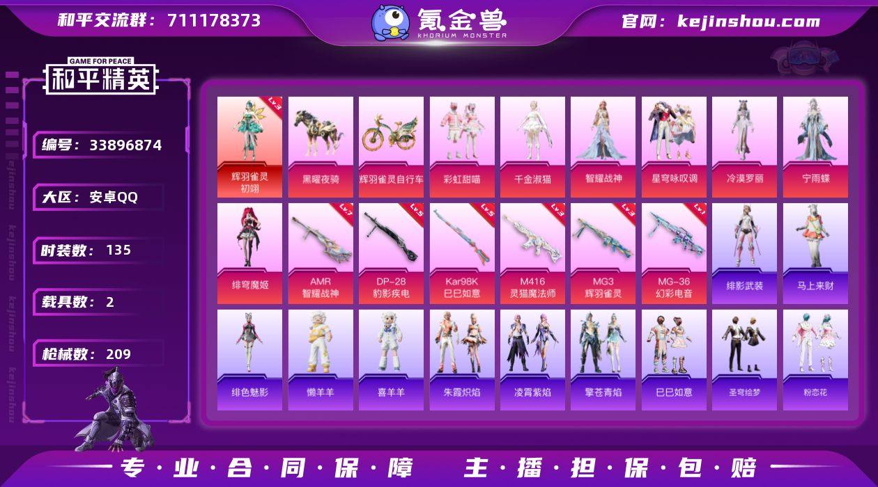 安卓 手Q-1神装-7粉装-6特效枪-2载具-9粉色飞行器-72438热力值-3王牌印记-135套装-209枪皮 【红色神装等级】:辉羽雀灵-初翊(三级) 【红色角色神装】:辉羽雀灵-初翊 【粉色套装】:粉装-彩虹甜喵,角色-千金淑猫,角色-智耀战神,粉装-星穹咏叹调,角色-冷漠罗丽,角色-宁雨蝶,角色-绯穹魔姬 【粉色枪皮等级】:M416-灵猫魔法师(三级),Kar98K-巳巳如意(五级),AMR-智耀战神(七级),DP-28-豹影疾电(五级),MG3-辉羽雀灵(三级),MG-36-幻彩电音(一级) 【粉色载具】:黑曜夜骑,辉羽雀灵自行车 【粉色枪皮】:M416-灵猫魔法师,Kar98K-巳巳如意,AMR-智耀战神,DP-28-豹影疾电,MG3-辉羽雀灵,MG-36-幻彩电音 【粉色飞行器】:炫彩糖果飞行器,星夜魔法师飞行翼,太空嘟嘟飞行器,绯果甜心飞行器,雀灵庇佑飞行器,御兔特攻飞行器,时光之吻飞行器,终晖之翼飞行器,灵猫魔法师飞行器 【粉色降落伞】:春暖花开降落伞,梦幻火箭降落伞,阿狸红降落伞,洛神天依降落伞,碧影闪光降落伞,庄周梦蝶降落伞,橘柚倾心降落伞,垂柳戏鸭降落伞,彩虹甜喵降落伞,旋转彩虹降落伞,暗夜鎏金降落伞,音爆索尼克降落伞,猪猪侠降落伞,智耀战神降落伞,圣斗士星矢降落伞,绯果甜心降落伞...