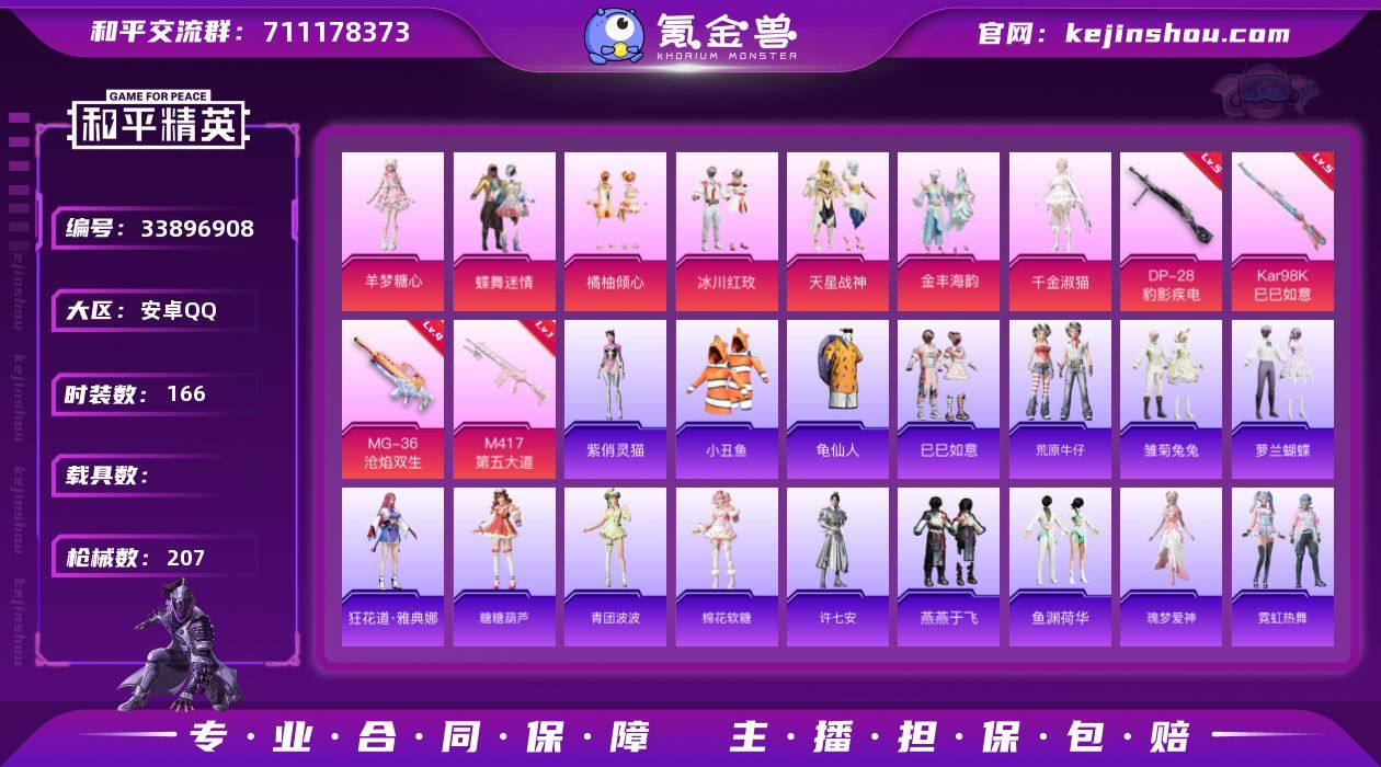 安卓 手Q-7粉装-4特效枪-0载具-2粉色飞行器-62141热力值-12王牌印记-166套装-207枪皮 【热门品类】:套装-小丑鱼,套装-龟仙人 【粉色套装】:粉装-蝶舞迷情,粉装-橘柚倾心,粉装-冰川红玫,粉装-天星战神,粉装-金丰海韵,角色-千金淑猫,角色-羊梦糖心 【粉色枪皮等级】:Kar98K-巳巳如意(五级),M417-第五大道(一级),DP-28-豹影疾电(五级),MG-36-沧焰双生(四级) 【粉色枪皮】:Kar98K-巳巳如意,M417-第五大道,DP-28-豹影疾电,MG-36-沧焰双生 【粉色飞行器】:炫彩糖果飞行器,星之彼岸飞行器 【粉色降落伞】:彩虹甜喵降落伞,第五大道降落伞,纯梦嫁纱降落伞,未来歌姬降落伞,圣堂之誓降落伞,精灵梦叶罗丽降落伞,守护天翼降落伞,金丰海韵降落伞,千金淑猫降落伞,鬼刀降落伞,喜羊羊与灰太狼降落伞,异瞳寒姬降落伞,炫彩糖果降落伞 【稀有套装】:套装-龟仙人,套装-巳巳如意,套装-荒原牛仔,套装-炫彩糖果,套装-雏菊兔兔,套装-萝兰蝴蝶,角色-狂花道·雅典娜,套装-糖糖葫芦,套装-青团波波,套装-棉花软糖,角色-许七安,套装-燕燕于飞,套装-鱼渊荷华,角色-瑰梦爱神,套装-霓虹热舞,套装-云朵鹅,套装-雪绒豹,角色-紫俏灵猫 【稀有枪皮】:AKM-彩虹符...